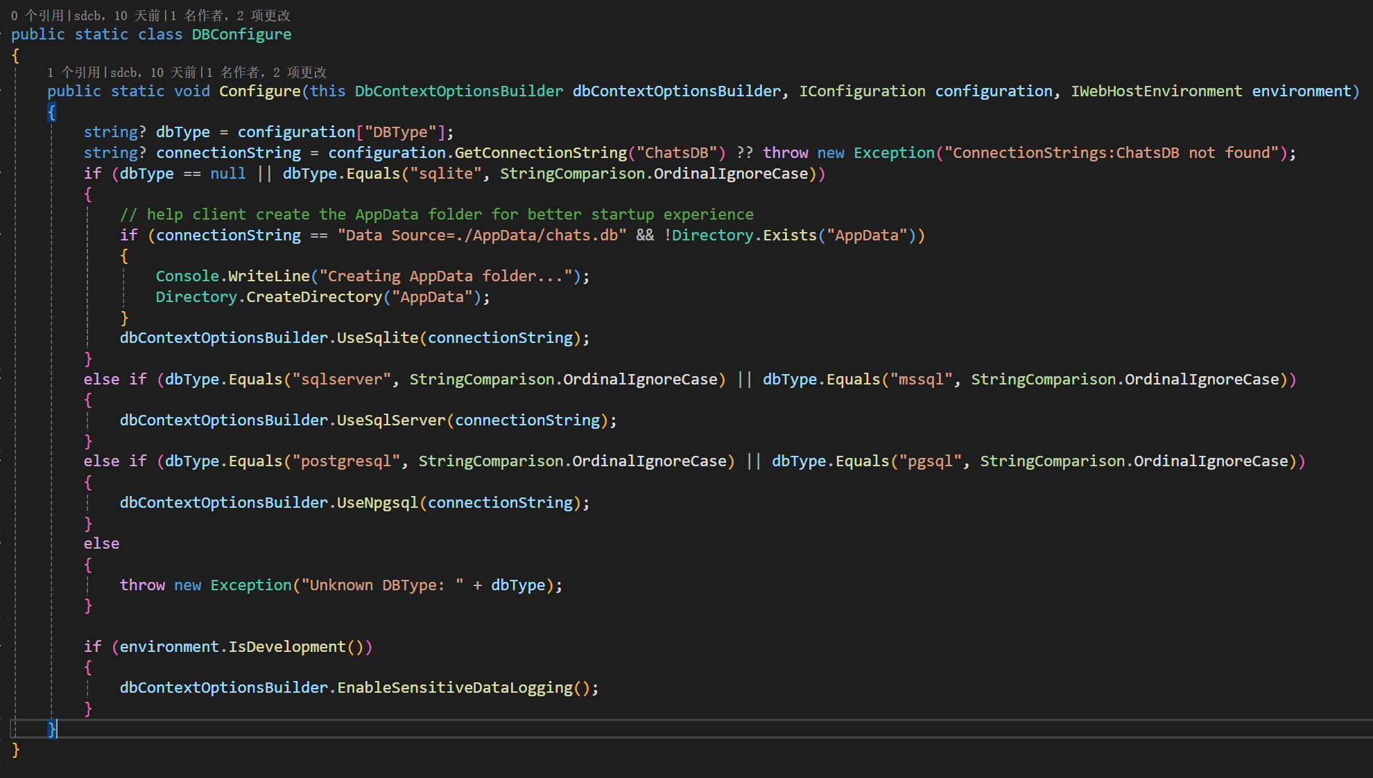 • 参数 --ConnectionStrings:ChatsDB:用于指定数据库的ADO.NET连接字符串。