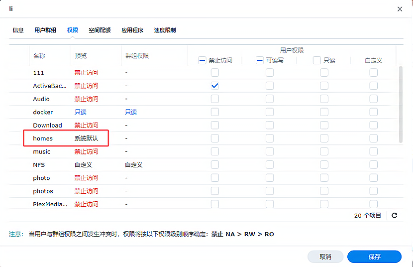 我这里以自己的理解打个小比喻,我们都知道银行金库内有好多的小金库,这些小金库保存的都是一些大人物所保存在里边的重要文件和物品。这些小金库只有这些大人物自己才能进行打开拿取物品,(特殊情况下银行的工作人员才可以去打开个人的小金库),这个保存个人物品的小金库就可以看做为“home“文件夹。那么银行这个大金库可以是作为”homes”文件夹。这个比喻也许不太严谨,但是道理是这样的,如果有更好的解释欢迎留言交流。 启用家目录的作用在于,当一台NAS有多人使用时,启用【家目录】功能,可以为每一位NAS用户(guest用户除外)自动创建个人「home」文件夹(也就是个人文件夹)。如果是一家几十人,甚至几百人的公司,开启【家目录】,就能在创建NAS账户时就自动建立一个账户文件夹了,而不用管理员手动一个个去创建个人文件夹了,大大减轻了工作量。如果是一个人使用那就没必要启用了。 还有两点需要注意,就是在安装特定软件的时候会提示让启用家目录,例如安装Synology Drive Server的时候会提示让启用家目录,这款网盘软件是需要区分开个人文件夹和团队文件夹的。 在一点就是我们在创建用户账号的时候不用去分配homes文件夹的权限,系统已经默认为用户分配好权限,如果您设置了homes文件夹的权限可能会出现个人文件夹无法访问或者能看到其他人员的个人文件夹数据。