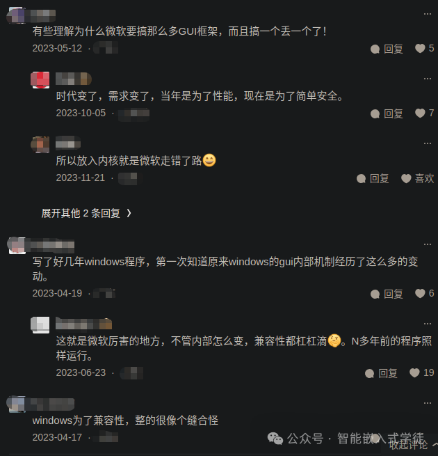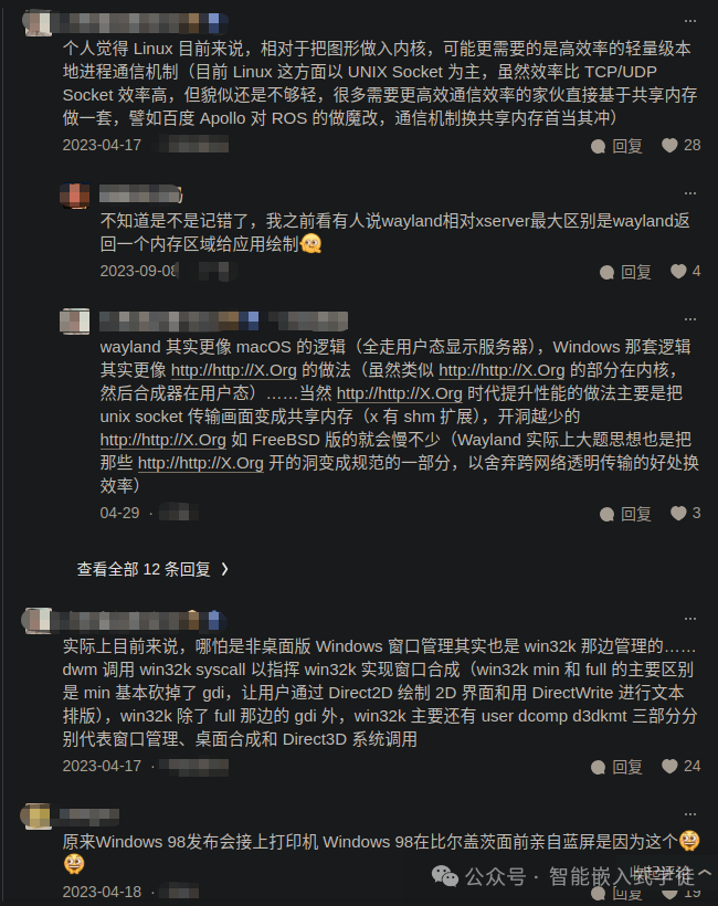 Linux GUI:用户态的自由Linux的GUI,如X Server和Wayland,完全在用户态运行。这使得Linux在GUI崩溃时,能像凤凰涅槃般重生,无需重启整个系统。这种设计,让Linux在GUI的灵活性和稳定性上,展现出独特的优势。 Linux GUI生态:丰富多彩Linux的GUI生态,从X11到Wayland,再到Android的SurfaceFlinger,每一种都在用户态提供了丰富的窗口管理和图形合成功能。这证明了Linux GUI的健壮和高效。 总结:Linux的“素颜”之美Linux的内核,以其“素颜”之美,展现了一种不依赖内核的GUI哲学。这种设计,让Linux在面对GUI挑战时,更加从容不迫,也更加自由。 --内容源于zhihu及kimi 网友看法
