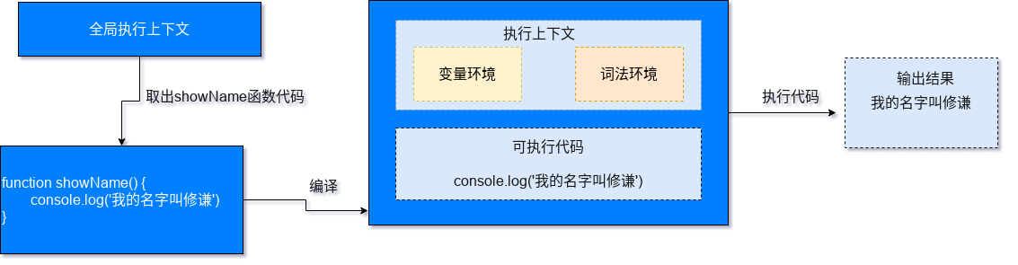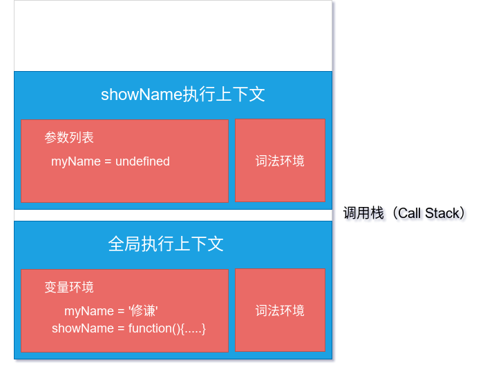那既然在编译阶段就在内存中固定了位置,为什么又会出现提升呢?编译阶段和变量提升存在什么关系呢?这里我们就不得不说到另外一个概念:执行上下文(Execution context) 2、执行上下文(Execution context)所谓执行上下文,我们可以简单的理解为就是 JavaScript 执行一段代码时的运行环境,比如当我们在JavaScript文件中调用一个函数,那么就会进入这个函数的执行上下文,就会确定该函数在执行期间用到的诸如 this、变量、对象以及函数等。并且在执行上下文中还存在一个变量环境的对象(Viriable Environment),这是非常重要的。因为该对象中保存了变量提升的内容,比如上面代码中的变量myName和函数showName,都会保存在该对象中(我们先用下面的这段代码模拟一下,后面在详细讲解)。 1 ViriableEnvironment(变量环境) 2 myName -> undefined 3 showName -> function: {console.log(myName)} 在JavaScript中,执行上下文一般分为以下三种: 1、全局执行上下文:当 JavaScript 执行全局代码的时候,会编译全局代码并创建全局执行上下文,而且在整个页面的生存周期内,全局执行上下文只有一份。 2、函数执行上下文:当调用一个函数的时候,函数体内的代码会被编译,并创建函数执行上下文,在一般情况下,函数执行结束之后,创建的函数执行上下文会被销毁。 3、eval :当使用 eval 函数的时候,eval 的代码也会被编译,并创建执行上下文。 但是我们现在常接触或者说的一般都是指前面两者。了解完执行上下文的概念和分类后,我们再来了解一下另外的两个知识点:函数执行(调用)和栈 3、函数执行(调用)函数调用概念很简单,简单一点来说就是运行一个函数,具体使用方式是使用函数名称跟着一对小括号。我们举个例子来说一下 1 var myName = '修谦' 2 function showName() { 3 console.log('我的名字叫修谦') 4 } 5 6 showName() // 执行 这段代码很简单。首先我们创建了一个名叫myName的变量,接着又创建了一个showName的函数。完后紧接着在最后面调用执行了该方法。下面我们就以这段简单的代码来说一下函数调用的过程。 当执行到函数showName()之前,JavaScript 引擎会为上面这段代码创建全局执行上下文,包含声明的函数和变量,如下图所示: