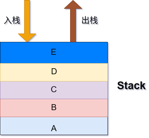 当执行到showName函数的时候,我们就有了两个执行上下文了——全局执行上下文和 showName 函数本身的执行上下文(函数执行上下文)。这也就是说在执行JavaScript 时,会存在多个执行上下文。那当有多个上下文的时候,JavaScript引擎是如何管理的呢?这就是我们下面要说到的一种数据结构——栈 4、栈(Stack)栈(Stack)是一种线性数据结构,遵循后进先出(Last In, First Out, LIFO)的原则。这意味着最后进入栈的元素会最先被移除。如下图所示,最先进入的是A,但是最先出的却是E。而avaScript引擎正是利用栈的这种结构来管理执行上下文的。在执行上下文创建好后,JavaScript引擎会将执行上下文压入栈中,然后进行执行,而通常把这种用来管理执行上下文的栈称为执行上下文栈,或者叫JavaScript调用栈。