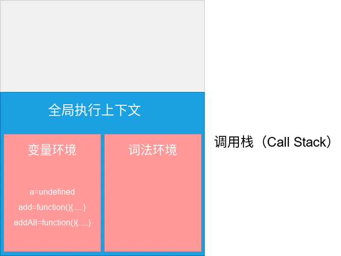 4、执行上下文栈(JavaScript调用栈)下面我们就来具体的用代码和图来模拟JS执行上下文栈是如何执行代码的,如下面一段代码(以ES5来演示)  1 var a = 2 2 function add(b,c){ 3 return b+c 4 } 5 function addAll(b,c){ 6 var d = 2 7 result = add(b,c) 8 return a+result+d 9 } 10 addAll(3,3) 第一步:创建全局上下,并将其压入栈底(如图所示)此时变量a、函数add 以及 addAll 都保存到了全局上下文的变量环境对象中。