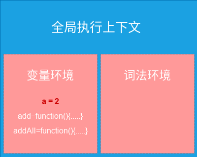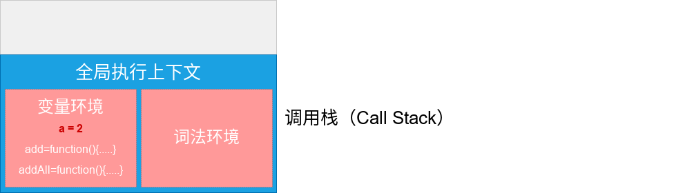 当全局执行上下文压入到调用栈后,紧接着,JavaScript引擎便开始执行全局代码了。首先会执行a=2的赋值操作,赋值完后,此前a的值就从undefined变成了2。因为此时的add函数和addAll函数都还没有执行,因此状态还是之前的。这一步完成后,我们再来看全局上下文的状态,如下图所示: