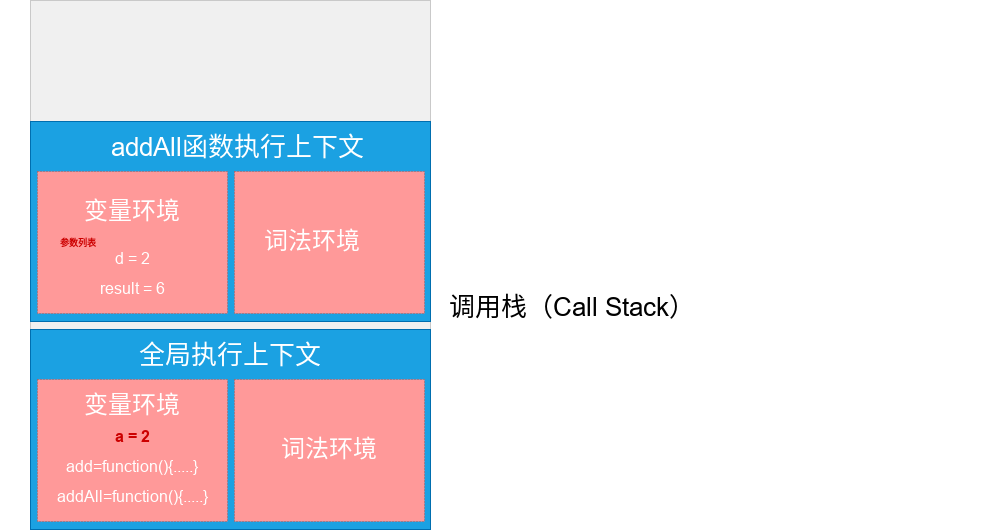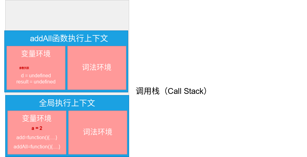 当函数内部作用域块执行结束之后,其内部定义的变量就会从词法环境的栈顶弹出,最终的执行上下文如下图所示: