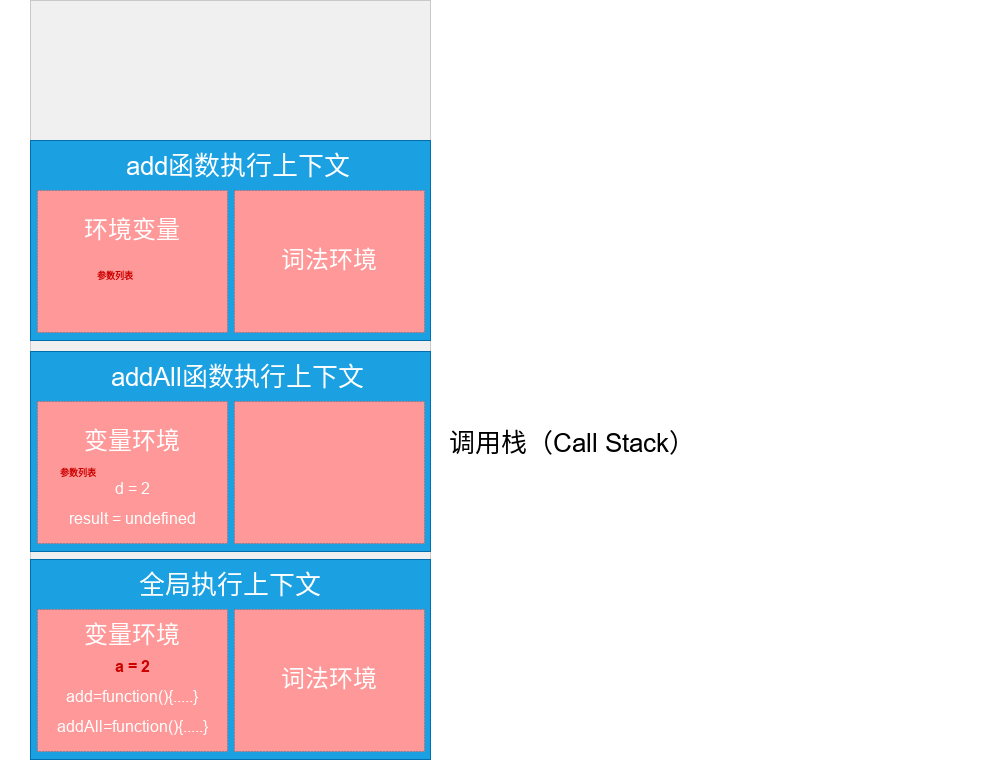 同样的,当addAll函数的执行上下文创建好之后,就会进入了函数代码的执行阶段了,因为函数中有一个变量d,因此还是先执行赋值操作,即将d的值从之前的d=undefined设置成d=10 。然后接着往下执行。 第三步:执行add函数,当执行到add函数调用语句时,JavaScript引擎同样又会为其创建执行上下文,并将其压入调用栈,此时的调用栈的状态如下图所示: