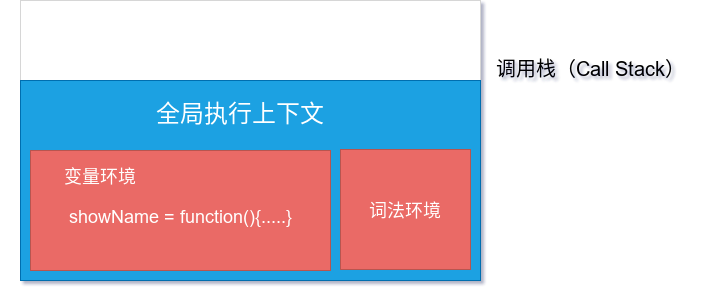 从图中可以看出,上面那段代码中全局变量和函数都保存在全局上下文的变量环境中。当执行上下文准备好之后,JavaScript引擎便开始执行全局代码,当执行到showName函数时,JavaScript判断出这是一个函数调用,于是便开始了以下操作: