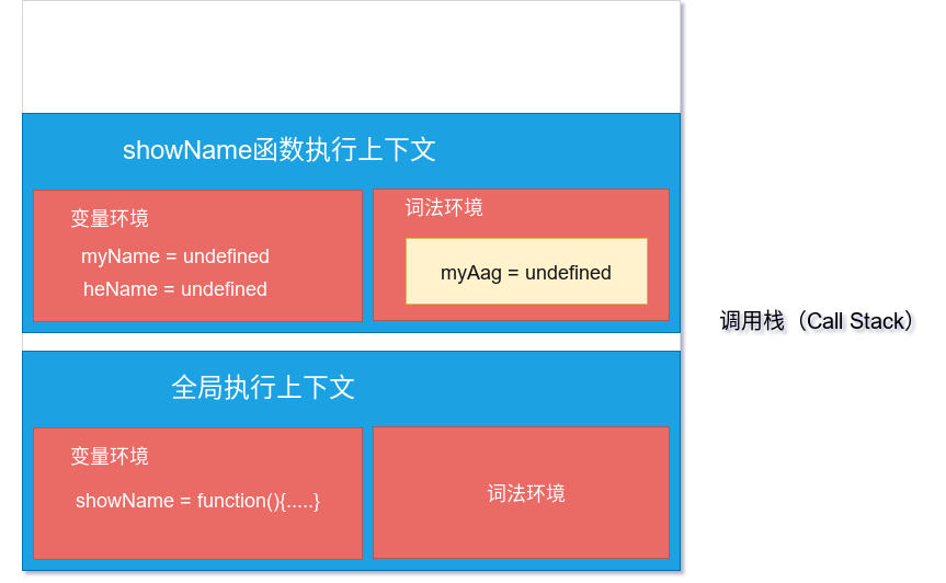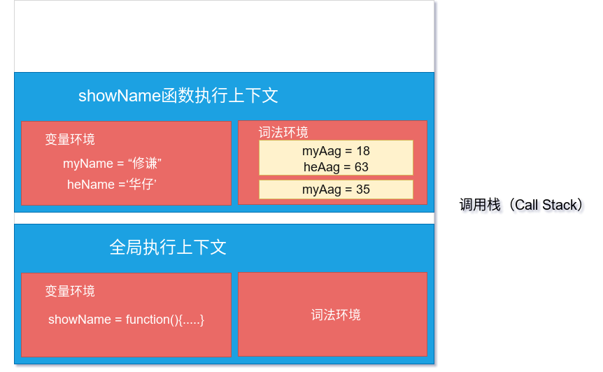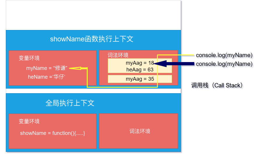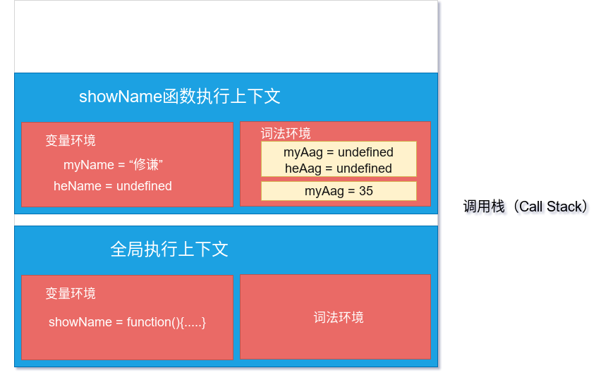 当showName函数的执行上下文创建后,JavaScript引擎便开始执行其内部的代码。首先执行的是console.log(myName)。而执行这段代码需要使用变量myName,而从图上我们可以看到,这里有两个myName变量:一个是在全局执行上下文中,其值是“修谦”;另外一个则是在showName函数的执行上下文中,其值是undefined。这个时候JS到底要使用哪一个输出呢?作为一个前端开发人员,我想绝大部分人都会说出正确的答案:“肯定是先使用showName函数执行上下文里面的变量啦!” 的确是这样,因为函数执行过程中,JavaScript会优先从当前所在的执行上下文中查找变量,但是因为变量提升的原因,当前的执行上下文中就包含了变量myName,而其值是undefined,所以获取到的myName的值就是undefined。而不是如其它语言一样,会输出“修谦”。 2. 本应销毁的变量没有被销毁 那既然在JavaScript中,变量提升会带来上面说到的那些个问题?最后的解决方案又是什么呢?答案就是在2015年的时候发布了新的JS标准——ECMAScript6(简称ES6)。在 该标准中,正式引入了块级作用域的概念。并且还引入了 let 和 const 关键字来声明块级作用域,至此,JavaScript也能像其他语言一样拥有了块级作用域。 7、ES6中的let和const关于let和const。我们还是先来看如下的代码 1 let myName = '修谦' 2 const myAag = 35 3 myName = '山人' 4 console.log(myName) 5 6 myAag = 18 7 console.log(myAag) 这段代码输出的结果,我觉得只要是写过JavaScript的人都应该知道结果是啥。第一个输出的是“山人”;而第二个则输出一个错误。从这里我们可以看出,虽然两者都是用来声明块级作用域的,但是两者之间还是有区别的,使用 let 关键字声明的变量是可以被改变的,而使用 const 声明的变量其值是不可以被改变的。说到这里我们也顺带说一下面试中常被问到的一个问题:在JavaScript中,什么是暂时性死区? 还是先看代码 1 function example() { 2 console.log(x); 3 let x = 10; 4 } 5 6 example(); 当我们把这段代码复制到到浏览器控制台的时候会报这样一个错误: “ReferenceError: Cannot access 'x' before initialization”。这个错误翻译过来是:引用错误:初始化之前无法访问“x”(翻译的可能不准,但是意思差不多)。从这个错误我们知道了在ES6中,当我们用let和const 声明的变量在声明之前是处于一种“未初始化”状态,而这种状态被称为暂时性死区(官方的定义是:在 JavaScript 中,"暂时性死区"(Temporal Dead Zone, TDZ)是指在块级作用域(如 let 和 const 声明的变量所在的代码块)中,在变量声明之前访问该变量会导致引用错误(ReferenceError))。 说完let和const,我们再来看以下的这两行简单的代码 1 var myName = '修谦' 2 let myAag = 35 这两行代码其实并没有什么特别的,我用其来就只是为了引出一个问题,即:JavaScript是怎么样在支持变量提升特性的同时又支持块级作用域的呢?因为我们在项目中,有时候你会发现有的人在代码中即会用var关键字来声明变量,同时又用let和const来声明变量。虽然这种方式不推荐,但是总归是不可避免的。前面我们已经谈到了变量提升特性。所以接下来我们重点谈的就是JavaScript是如何支持块级作用域的。 8、JavaScript 是如何支持块级作用域的?前面我们说到,在JavaScript引擎中是通过变量环境实现函数级作用域的,那么在 ES6 中,又是如何在其基础之上,实现对块级作用域的支持呢?我们还是先来看下面的一段代码  1 function showName(){ 2 var myName = '修谦' 3 let myAag = 35 4 { 5 let myAag = 18 6 var heName = '华仔' 7 let heAge = 63 8 console.log(myName) 9 console.log(myAag) 10 } 11 } 12 showName() 当执行上面这段代码的时候,JavaScript引擎会先对其进行编译并创建执行上下文,然后再按照顺序执行代码,之前我们的例子是没有使用ES6中的关键字let。但是现在引入了 let 关键字,它会创建块级作用域,那么它是如何影响执行上下文的呢?这里我们就不得不提到一个名词——词法环境。你应该还记得之前的例子中,右边一直有一块空着的,名叫词法环境的块。而JavaScript之所以支持块级作用域,就是与它有关。 下面我们还是按照之前的方式来梳理一下这段代码的执行。 第一步:编译并创建全局执行上下文