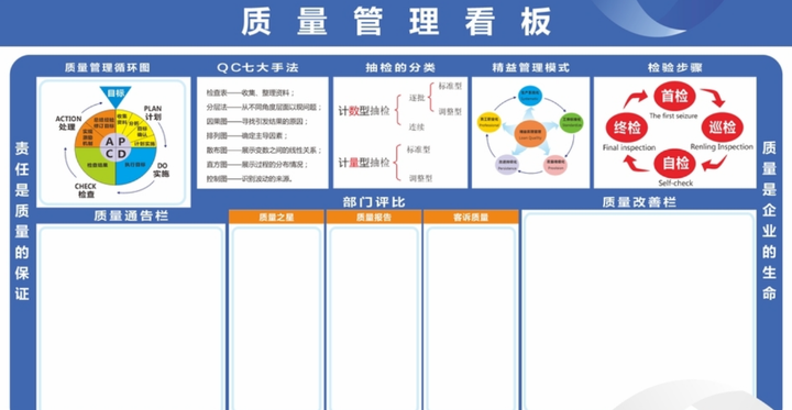 产品质量问题一直是每一个企业高度关注的事情,其中很大一部分取决于生产过程控制。生产过程出现的问题不能私下处理解决了就完了,必须通过各种形式广而告之,一是教育责任本人,二是更为了教育其他人,重复犯错是不能容忍的,那么这个重任就落在了看板身上了。看板和口头上说说不一样,领导上口头上说,话语转瞬即逝,不容易在员工脑海中留下深刻印象,并且记不得清晰的原因分析和闭环措施;而看板时时刻刻挂在那里,视觉冲击力较强,也能详细把一件事情说透。有研究显示,一个人接受的信息90%是通过视觉得到的,可见视觉信息的重要性。作为生产制造企业,质量看板普遍设立有质量工艺红黑榜,A3报告看板,技能考核成绩看板等。在一些企业,质检部门在产品检验时,发现质量或工艺问题,不合格单一开,然后立即进入处罚环节,这件事情就结束了。这样处理事情太孤立,没有彻底的原因分析,没有问5个为什么,没有教育广大其他员工。但这方面做的好的企业,一方面通过看板公示问题现象和出现频次概率,另外紧跟着用A3报告的形式,分析真正原因,制定闭环措施(修改流程、作业指导书,改进工装夹具等),然后教育、培训所有员工。为了提升生产过程质量,车间定期开展工艺、工序操作理论和实操培训、考核,张榜公布各班组、所有员工考核成绩,表扬优秀,鼓励落后。当然考核不合格者,进入再培训、轮岗和待岗状态,质量问题应从这些源头控制,而不是只盯着最后不合格品处罚。当然质量问题还有研发、供应商、设备等其他环节因素,这儿不展开论述。质量看板充分借助了看板的公开性、清晰性和荣辱观,数据立在那里比过眼云烟强似百倍。3、以车间现场的6S看板为例