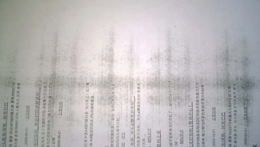 原因:此现象一般出现在针式打印机上,喷墨打印机也可能出现,不过概率较小,主要是打印头导轨与打印辊不平行,导致两者距离有远有近所致。 解决方法:调节打印头导轨与打印辊的间距,使其平行。 具体做法是:分别拧松打印头导轨两边的调节片,逆时针转动调节片减小间隙,最后把打印头导轨与打印辊调节到平行就可解决问题。 六、打印纸上重复出现污迹
