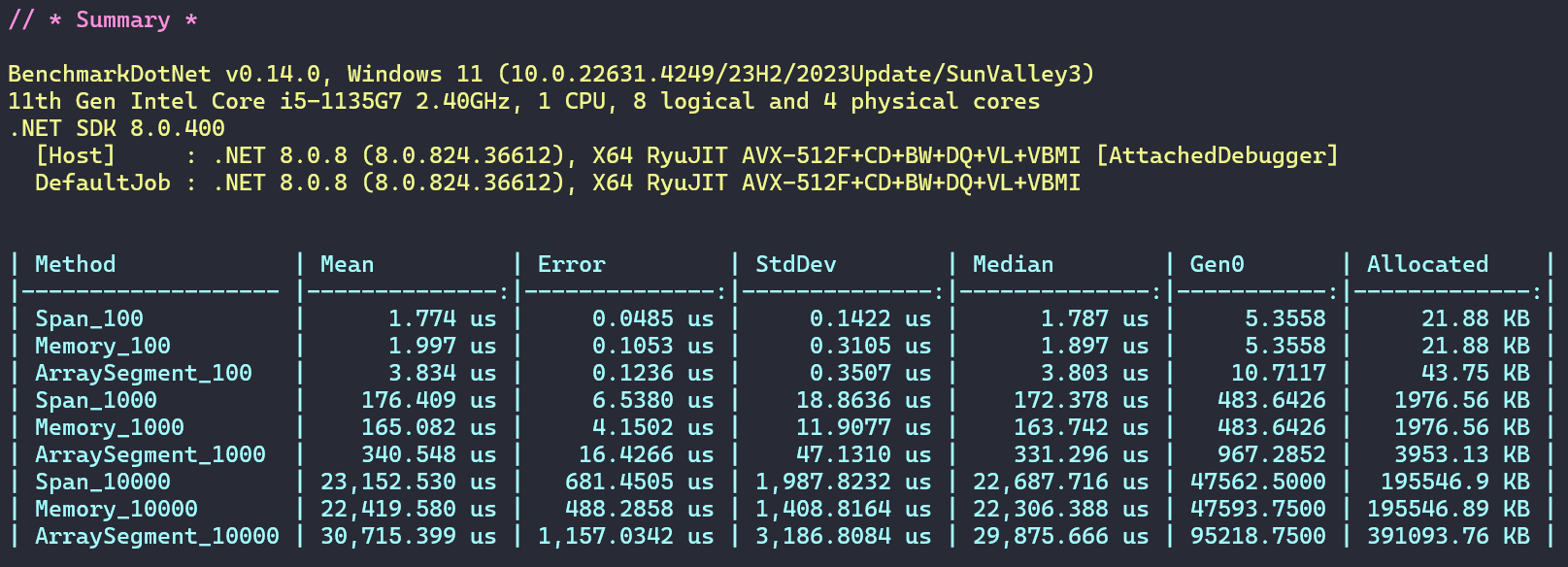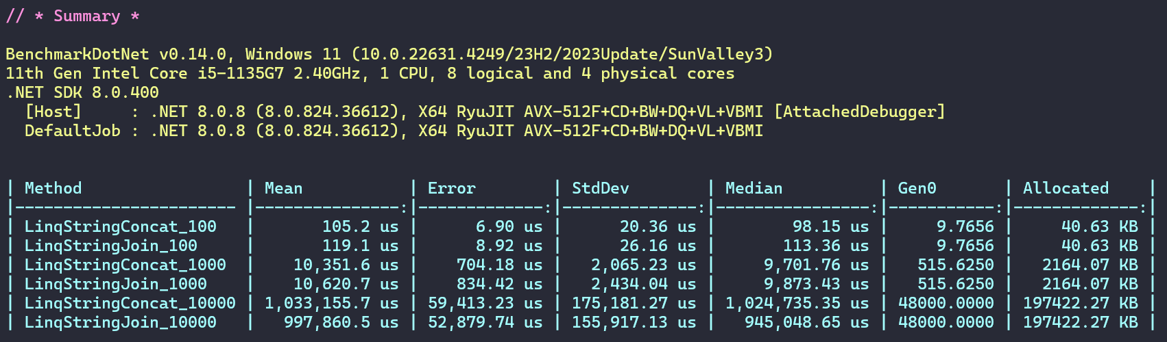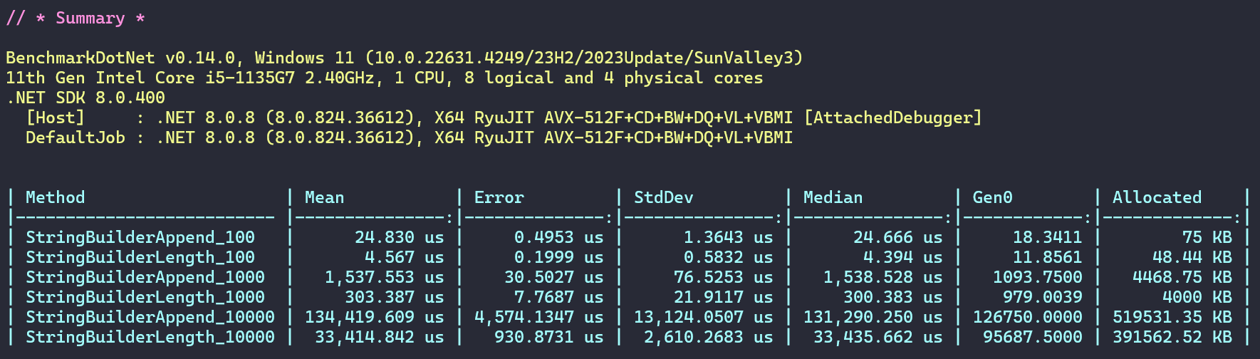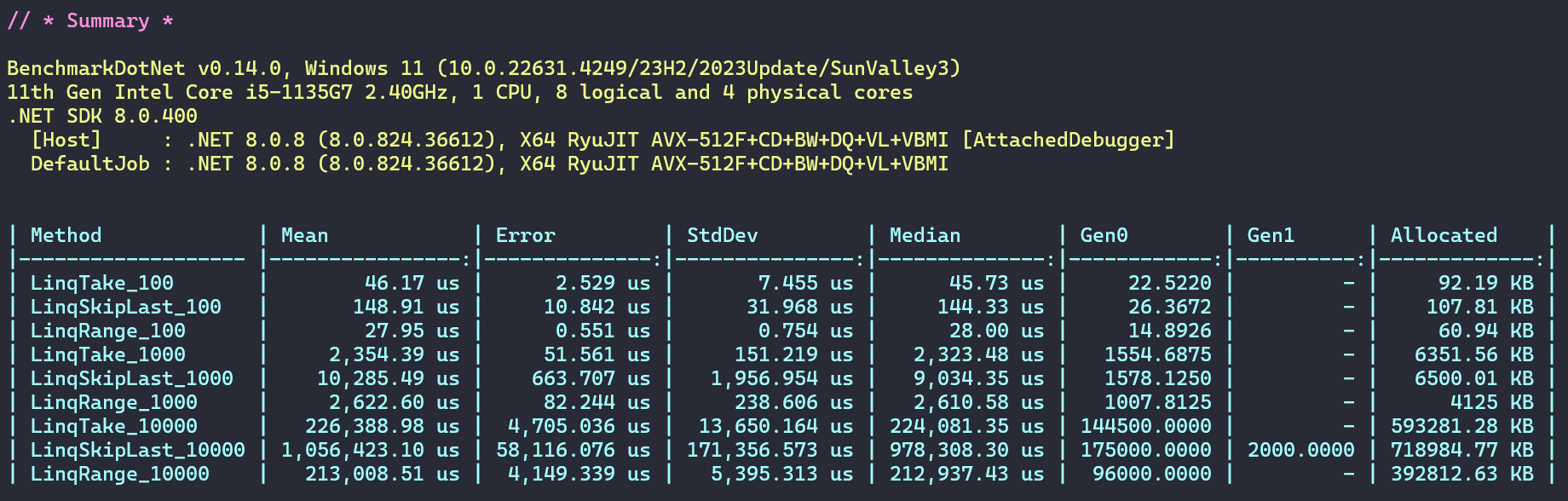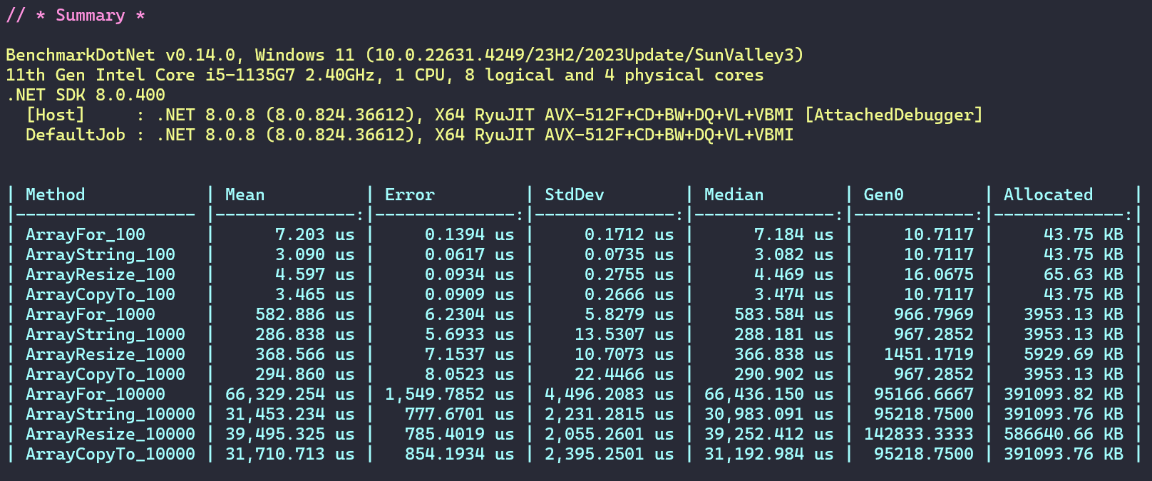 01、第一类、字符串方式这类方法是通过string类型自身方法直接实现。 1、Substring方法相信大多数人第一个想到的可能就是这个方法。Substring方法是字符串内置方法,可以通过指定起始索引位置为0以及长度为字符串长度减1,直接截取指定长度的子字符串,从而达到删除最后一个字符目的。 示例代码如下: 2、范围运算符这个方法可以说是最简洁的方法,可能大家用的不是很多。范围运算符是从C# 8开始支持的。它的形式如:variate[start..end],指定某一索引范围的开头和末尾作为其操作数。左侧操作数是范围的包含性开头。右侧操作数是范围的不包含性末尾。任一操作数都可以是序列开头或末尾的索引。 下面列举了表达集合范围的各种方法: 范围运算符也适用于字符串,实现代码如下: 3、Remove方法Remove方法是字符串内置方法,可以删除从指定起始索引位置起到结尾的所有字符,因此可以把起始索引定为最后一个字符,从而达到删除最后一个字符目的。 示例代码如下: 4、Create方法Create方法是字符串的静态方法,这个方法相信大家用的比较少,其作用是创建一个具有特定长度的新字符串,并在创建后使用指定的回调对其进行初始化。下面我们直接看下实现代码: 下面对上面代码做个简单解释,第一个参数source.Length - 1是创建比原字符串长度少1位的目标字符串;第二个参数source是把原字符串当作参数传入,用于给第三个参数使用;第三个参数是一个两个参数无返回值委托,其中span参数表示目标字符串对应的Span 5、小结上面四种方法主要是使用了字符串自身的内置方法进行操作,下面我们对四个方法进行三组对比性能测试,每组分别为长度为100、1000、10000的字符串。 通过测试结果不难发现,除了Create方法,其他三个方法差别不大,综合来看可以说Remove最优。 02、第二类、StringBuilder方式如果需要对大量字符串操作,相信大家会立即想到用StringBuilder来进行性能优化,下面简单介绍两种使用StringBuilder方式来删除字符串最后一个字符。 1、Append方法字符串就相当于字符数组,因此我们可以循环字符串,然后使用StringBuilder的Append方法进行拼接,实现代码如下: 2、Length方式相信大家看到这个标题应该比较疑惑,这是什么意思,我们先看代码再讲解: 首先第一行代码表示通过原字符串创建一个可变字符串;重点就在第二行,直接对StringBuilder长度执行减1操作;最后再把StringBuilder转为字符串返回。 首先StringBuilder的Length属性表示当前可变字符串包含的字符数,当对其进行减1操作时,相当于告诉StringBuilder对象忽略最后一个字符,其内部并没有真的删除任何字符,被忽略的字符仍包含再StringBuilder对象内部,只是不再将其视为字符串的一部分,因此在调用.ToString方法时返回的就是我们想要的字符串。 3、小结下面我们对两个方法进行三组对比性能测试,每组分别为长度为100、1000、10000的字符串。 通过这组测试结果很容易发现,直接操作Length属性性能显著优越于Append方法,但是和字符串直接操作的方式相比还差了不少。 03、第三类、Array方式上面我们提到字符串相当于字符数组,因此我们可以直接使用数组相应的方法。 1、For方法我们可以直接构建一个目标字符数组,然后把原字符串中相应的字符复制到新字符数组中,最后把新字符数组转成字符串返回即可,代码如下: 2、Resize 方法这个方法大家可能用的比较少,它可以把数组元素个数更改为指定的大小。其思想有点像上面StringBuilder对象直接修改Length属性。下面直接看看代码: 3、CopyTo方法这个方法相信大家应该有点影响,我们前面的文章也有提到过。简单来说就是把原数组复制到目标数组中,代码如下: 4、String方式String方式是值当把原字符串转换为字符数组后,直接使用String构造方法从字符数组中指定位置处开始并指定长度,来获取我们想要的结果。代码如下: 其中字符串构造函数第一个参数表示字符数组,第二个参数表示从字符数组第0个索引开始,第三个参数表示取字符数组的元素个数。 5、小结同样对上面四种方法进行三组对比性能测试,每组分别为长度为100、1000、10000的字符串。 通过测试结果不难发现,CopyTo方法和String方式相对较好,比之StringBuilder方式还要好些。 04、第四类、Linq方式Linq方式的核心思想是通过Linq方法获取目标字符串对应的字符数组,然后再转为字符串返回。 1、Take方法Take方法主要作用是从序列的开头返回指定数目的连续元素,因此代码实现如下: 2、SkipLast方法SkipLast方法是从C# 8才开始有的,其作用是返回集合排除最后指定个数的元素外的所有元素。 3、Range + Select方法Range方法相信大家用的也比较少,其作用是生成指定范围内的整数序列。我们先来看代码然后再做解释: 这里Range方法相当于生成了目标字符串索引序列,即[0.. source.Length - 1],然后再通过Seletc方法取原字符串相应的字符,最后得到结果。 4、小结同样对上面三种方法进行三组对比性能测试,每组分别为长度为100、1000、10000的字符串。 通过测试结果不难发现,Range + Select方法相对较好,但是比之前几类方法就差的太远了。 05、第五类、Linq + String组合方式这类方法是通过Linq方法和字符串方法组合的方式实现。 1、Concat方法Concat方法是字符串的静态方法可以连接多个字符成为一个新的字符串,然后通过Linq的SkipLast方法配合达到我们的目的,代码如下: 2、Join方法Jo