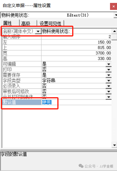 2、在BOM中增加【单据头字段】,将其名称修改为“物料使用状态”,同时指定默认值为“使用”。