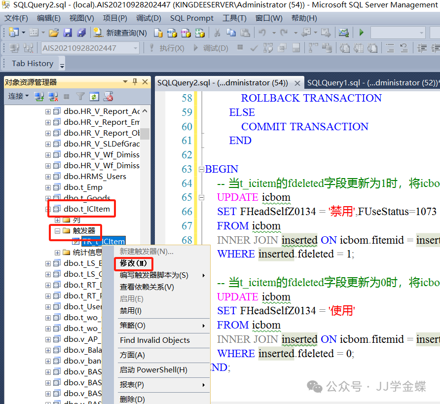 3、在SSMS控制台修改t_ICItem视图中的触发器