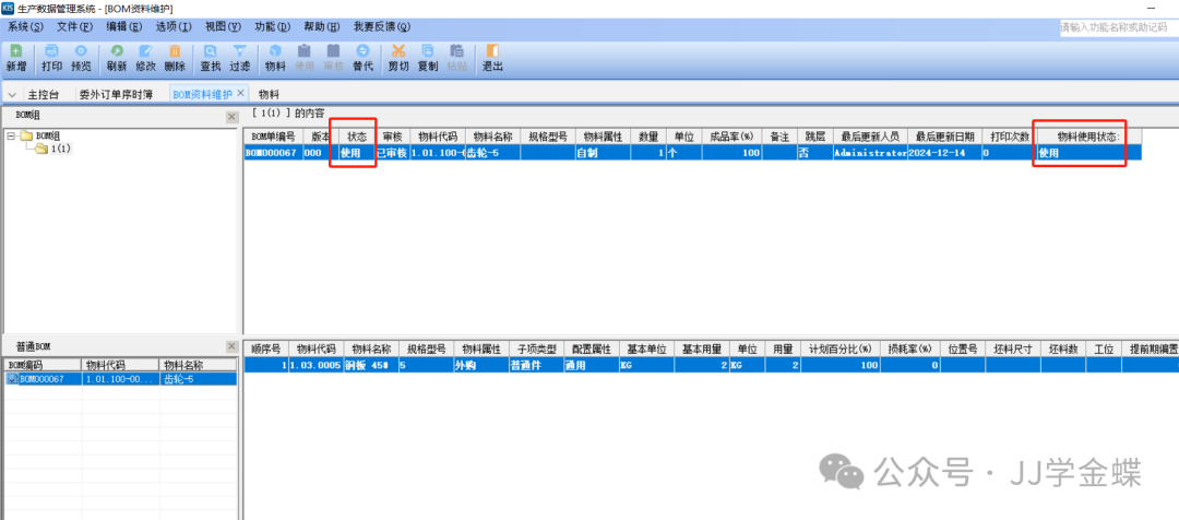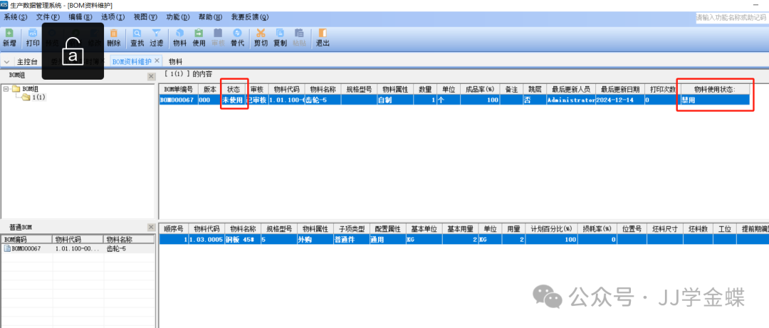 物料禁用前BOM状态为使用,物料使用状态为“使用”