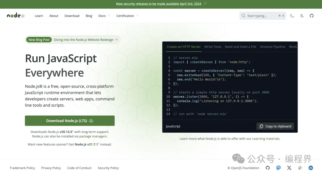 大概在 2024 年 3 月,Node.js 迎来了自己的新官网,带来了全新的外观变化。看其技术选型,也是紧跟潮流,用到了最新的 Next.js App Router 框架。