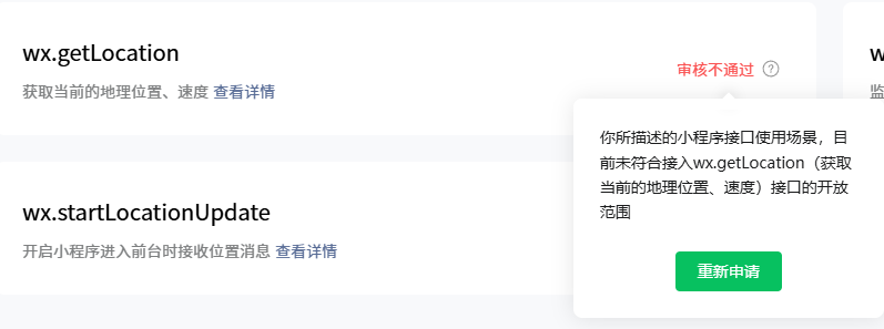 我第一感觉是申请支持高精度定位的wx.getLocation,模精定位特有接口能做的支持高精度定位也一定能实现需求,于是我就申请了wx.getLocation接口,同时针对场景截了图提交了申请,一天后发现申请不通过,于是又完善了资料再次提交又碰壁了,二天二次申请都被打回,一脸蒙逼。