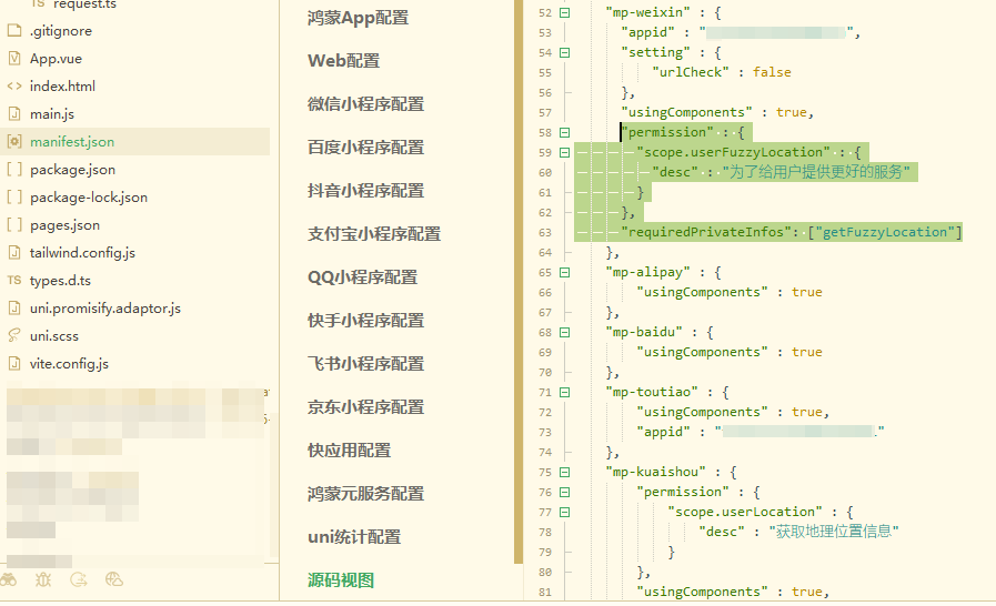 2. 填写接口权限配置:原生小程序在app.json里配置,uniapp在manifest.json里配置