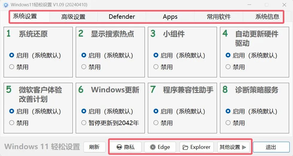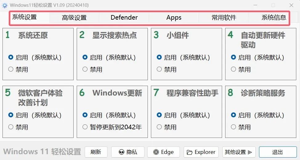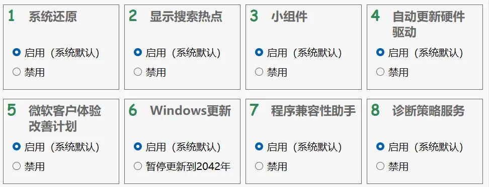 我们来分别打开它们看一下有哪些优化功能: 在系统设置中包括了: 启用或禁用系统还原;启用或禁用显示搜索热点;启用或禁用小组件;启用或禁用自动更新驱动;启用或禁用微软客户体验;启用或禁用windows更新;启用或禁用程序兼容性助手;启用或禁用诊断策略服务