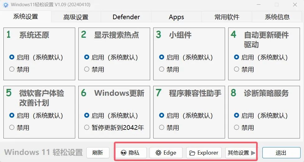 在底部还有卸载edge浏览器,设置资源管理器,和系统功能调节几个设置。