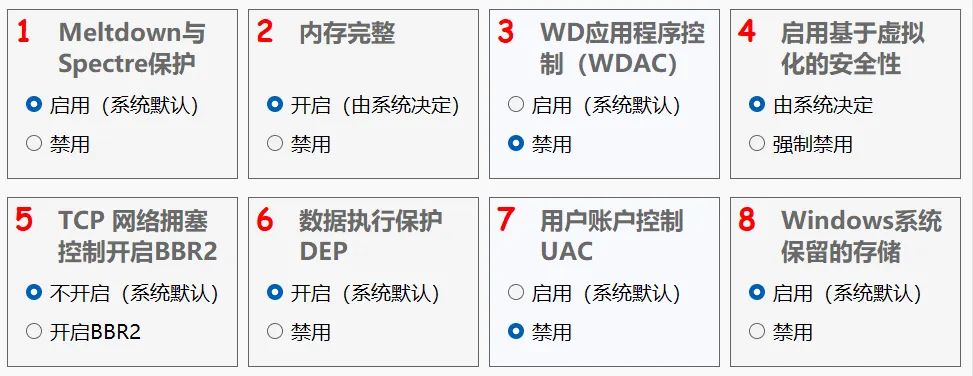 在高级设置中包括了: 启用或禁用meltdown与spectre保护;启用或禁用内存完整性;启用或禁用wd应用程序控制(WDAC);启用或禁用虚拟化安全性(VBS);开启或关闭TCP网络拥塞控制开启BBR2;启用或禁用数据执行保护(DEP);启用或禁用用户账户控制UAC;启用或禁用windows系统保留的存储