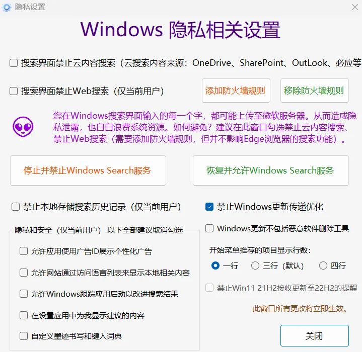 在隐私设置中包含了: 搜索界面禁止云内容;搜索界面禁止web搜索;一键关闭或开启win11的搜索功能;禁止windows更新传递优化等