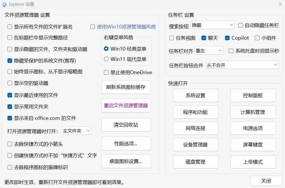 explorer设置里面可以对资源管理器进行优化,可以还原win10风格的右键菜单,同时还可以对任务栏进行一站式设置。