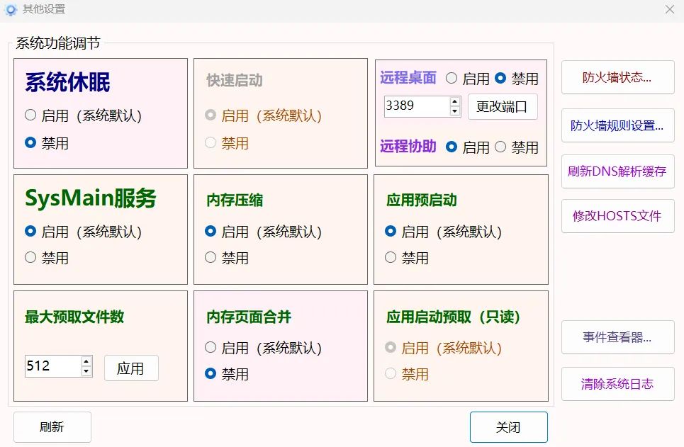 在其他选项中包括了关闭系统休眠,关闭远程桌面和远程协助,关闭sysmain服务等。