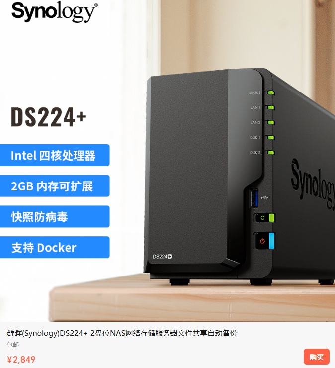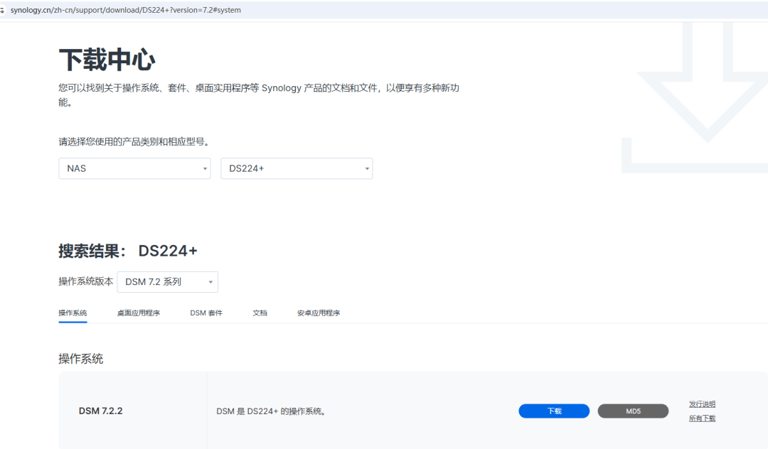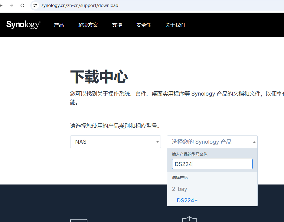 硬盘和NAS设备都正常安装完成之后,下面我们就需要为这个NAS设备安装,群辉的操作系统。 那这个设备如何安装操作系统呢? 这时我们需要找一台电脑,和NAS设备连接在同一个局域网,然后打开官方网站。选择NAS产品,型号选择DS224+。
