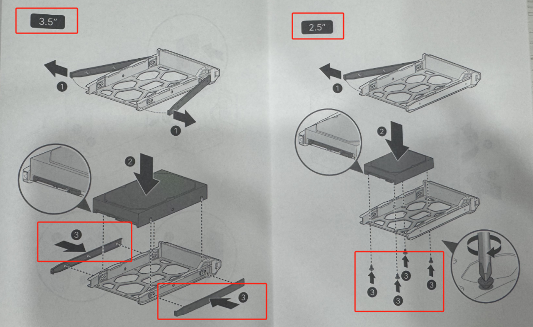 3.5寸硬盘,是通过两边的卡扣固定,如果是2.5寸硬盘,就是通过底部螺丝固定。