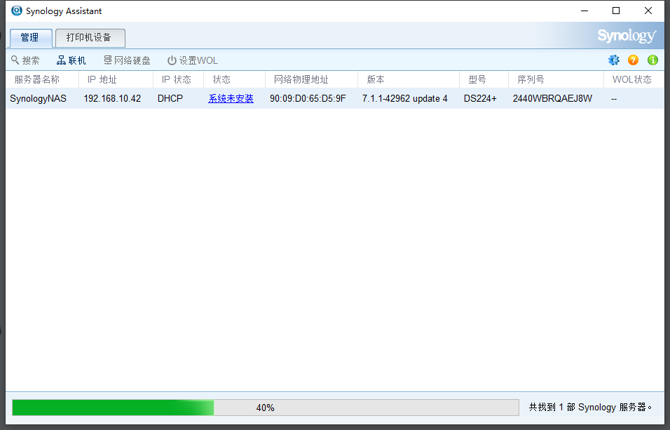 这时可以看到,当我们运行群辉助手时,这个软件可以自己搜索到,这个NAS存储设备,型号、IP地址、MAC地址、序列号都可以被搜索出来,我们可以在状态中看到,这个设备的系统显示的是未安装。