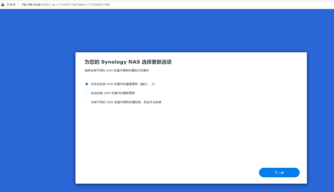 安装系统有两种方式,第一种就是下载好NAS的系统,直接上传进行安装,第二种方法就是自动从Synology网站下载安装最新DSM 7.2.2-72806版本。因为我们没有下载操作系统,所以我们直接选择第一个,从Synology网站下载安装系统。