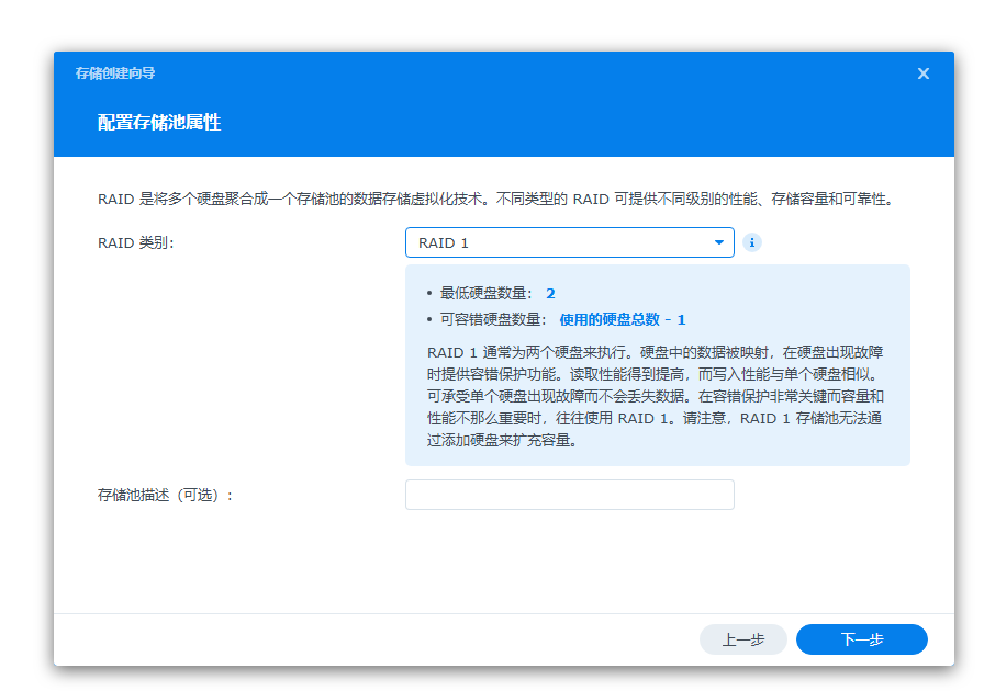 RAID模式选择,如果选择的是SHR,一般新手就可以选择SHR,当NAS里面只有一颗硬盘的时候,磁盘阵列的模式为basic,无数据保护。当再添加为一个硬盘的时候磁盘阵列的模式自动转换成类似raid1模式,空间大小不变,但是多了个数据保护。当再加入一个硬盘的时候会自动转换成类似raid5模式,当然了,你的NAS也要有支持3个盘位。
