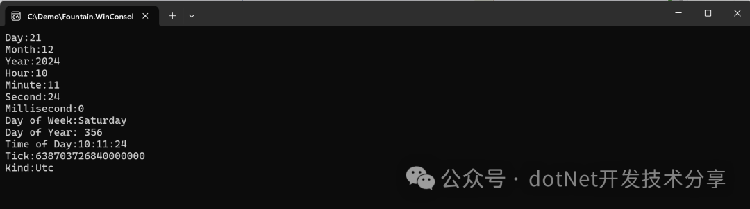 namespace   Fountain . WinConsole . DateTimeDemo {     internal  class   Program     {          static   void   Main ( string [] args)         {              DateTime  preDateTime =  new   DateTime ( 2024 ,  12 ,  21 ,  10 ,  11 ,  24 , DateTimeKind . Utc );              Console . WriteLine ( "Day:{0}" , preDateTime. Day );              Console . WriteLine ( "Month:{0}" , preDateTime. Month );              Console . WriteLine ( "Year:{0}" , preDateTime. Year );              Console . WriteLine ( "Hour:{0}" , preDateTime. Hour );              Console . WriteLine ( "Minute:{0}" , preDateTime. Minute );              Console . WriteLine ( "Second:{0}" , preDateTime. Second );              Console . WriteLine ( "Millisecond:{0}" , preDateTime. Millisecond );              Console . WriteLine ( "Day of Week:{0}" , preDateTime. DayOfWeek );              Console . WriteLine ( "Day of Year: {0}" , preDateTime. DayOfYear );              Console . WriteLine ( "Time of Day:{0}" , preDateTime. TimeOfDay );              Console . WriteLine ( "Tick:{0}" , preDateTime. Ticks );              Console . WriteLine ( "Kind:{0}" , preDateTime. Kind );              Console . Read ();         }     } }