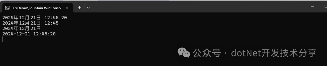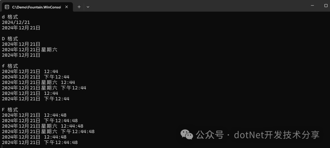 DateTime dateTime = DateTime.Now; // 日期时间格式: d, D, f, F, g, G, m, o, r, s, t, T, u, U, Console.WriteLine( "d 格式" ); string[] dateFormats = dateTime.GetDateTimeFormats( 'd' ); foreach  (string  format  in dateFormats) {     Console.WriteLine( format ); } Console.WriteLine( "D 格式" ); dateFormats = dateTime.GetDateTimeFormats( 'D' ); foreach  (string  format  in dateFormats) {     Console.WriteLine( format ); } Console.WriteLine( "f 格式" ); dateFormats = dateTime.GetDateTimeFormats( 'f' ); foreach  (string  format  in dateFormats) {      Console.WriteLine( format ); } Console.WriteLine( "F 格式" ); dateFormats = dateTime.GetDateTimeFormats( 'F' ); foreach  (string  format  in dateFormats) {     Console.WriteLine( format ); } //  2024 年 12 月 21 日  12 : 41 : 33 Console. WriteLine (dateTime. ToString ( "F" )); //  2024 年 12 月 21 日  12 : 42 Console. WriteLine (dateTime. ToString ( "f" )); //  2024 年 12 月 21 日 Console .WriteLine (dateTime .ToString ("D")); //  2024 - 12 - 21   12 : 44 : 05 Console. WriteLine (dateTime. ToString ( "yyyy-MM-dd HH:mm:ss" ));