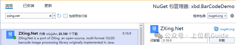 我们通过Nuget搜索zxing.net即可搜索安装。