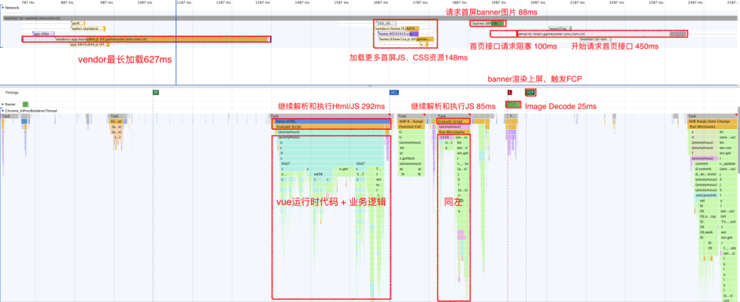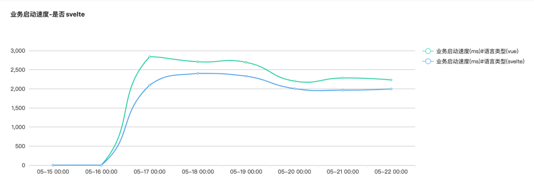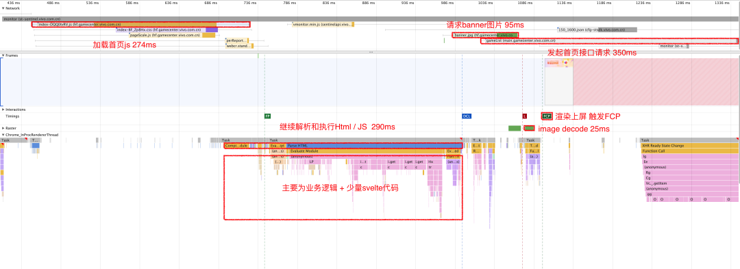 平均启动速度 vue 2493 ms svelte 2132 ms 差值 361 ms 优化程度 14.5% ↑ 以看到 Svelte 在线上的启动速度表现也比 Vue 要快一些,优化程度约为14.5%。 注意:这里的平均启动速度指标是我们团队内部定义的页面启动速度指标,计算方式:业务启动速度 = 页面加载完成时间 - 页面入口点击时间。由于我们是在客户端 App 中进行测试,因此该时间包含了客户端 webview 的启动时间。所以实际上 Svelte 对前端部分的启动速度优化程度可能会更高,参考前面的 FCP 指标的本地测试结果。 总之,对于小型项目,Svelte 在包体大小和启动速度上还是有不少提升的,如果你的项目对启动速度有强要求,也可以尝试使用 Svelte 来开发或改造,应该会有不错的效果。 六、Svelte 比 Vue 快在哪? 通过上面的数据分析,虽然我们了解到 Svelte 在构建小型项目时确实有更快的页面启动速度,但具体快在哪,还需要进一步深入分析。 我们可以通过 Chrome 的 devtool 来观察 Svelte 和 Vue 两者打包后的页面在加载流程上的差异。 Vue 页面加载流程: