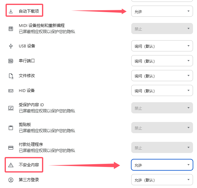 然后将“自动下载项”和“不安全内容”都改为“允许”即可:
