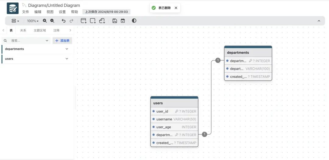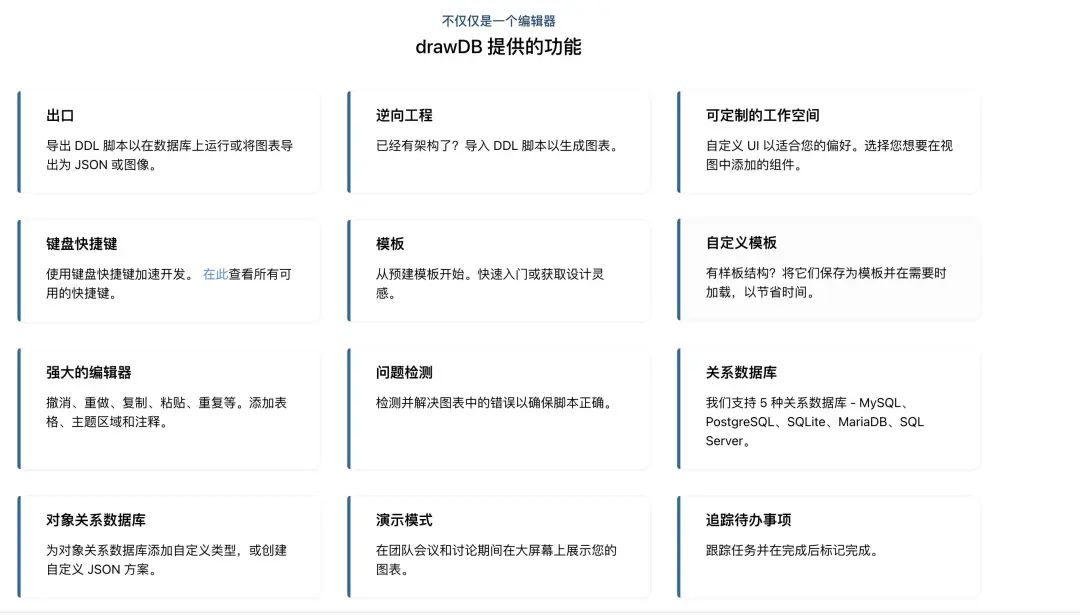 图形化界面DrawDB提供了一个直观的拖放界面,让数据库设计和管理变得简单而高效;用户可以通过图形化的方式创建、编辑和删除数据库的表、字段以及关系。