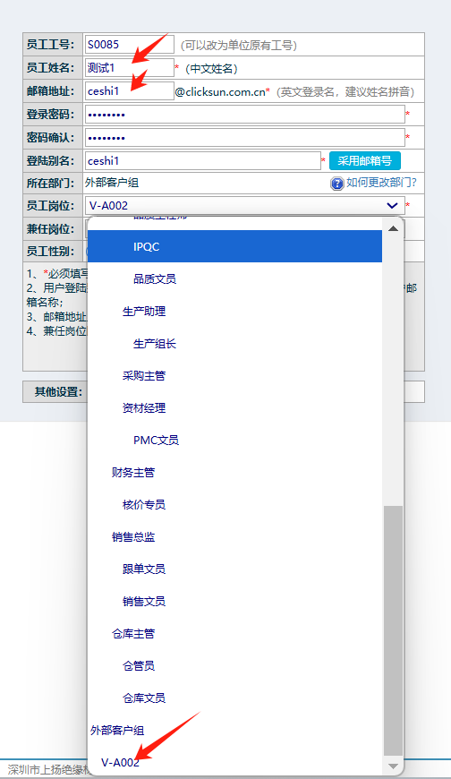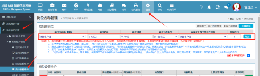 操作步骤:设置-系统维护设置-系统维护管理-岗位名称管理,在外部客户组岗位创建下级岗位,如下图所示: ![]() 2. 在左侧的功能菜单下的”系统维护设置-用户帐号管理-增加系统用户”,点击进入。 ![]() 3、填写用户名,选择员位岗位,注意岗位需要选为外部客户组下级岗位,初始密码为123456。填选完毕后,点击添加即可。 注意:岗位一定要选外部客户组下级岗位如下图所示: ![]() 3. 设置ERP权限 操作步骤:ERP-系统管理-用户管理-用户权限维护,如下图,注意选ERP子系统权限 ![]()