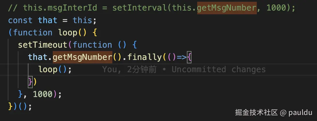 在上面的代码片段中,声明了一个具名函数 loop(),并被立即执行。loop() 在完成代码逻辑的执行后,会在内部递归调用 setTimeout()。虽然该模式不保证以固定的时间间隔执行,但它保证了上一次定时任务在递归前已经完成。