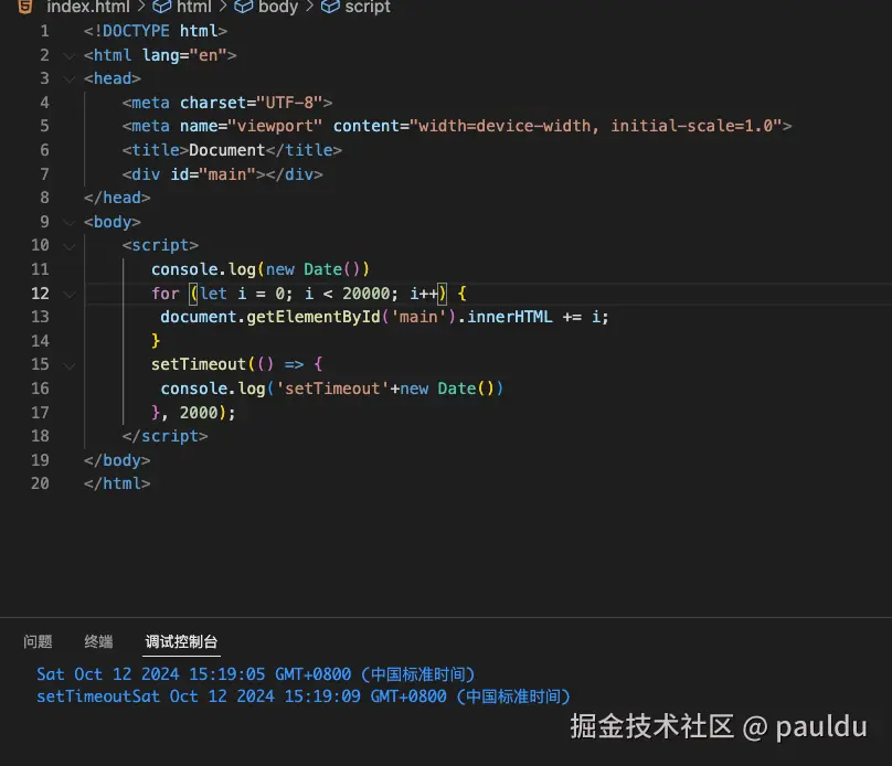 我们做个实验,我们对id为main对dom进行2万次的修改innerHtml,在控制台打印时间,