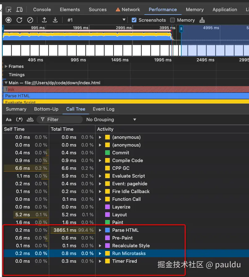 这里其实就涉及到了js的事件为单线程机制,我们用performance简单分析下,看到有个3865ms的parse HTML的,然后执行Run Microtasks也就是微任务,也就是等我们的同步任务执行后,再去执行settimeout内的东西