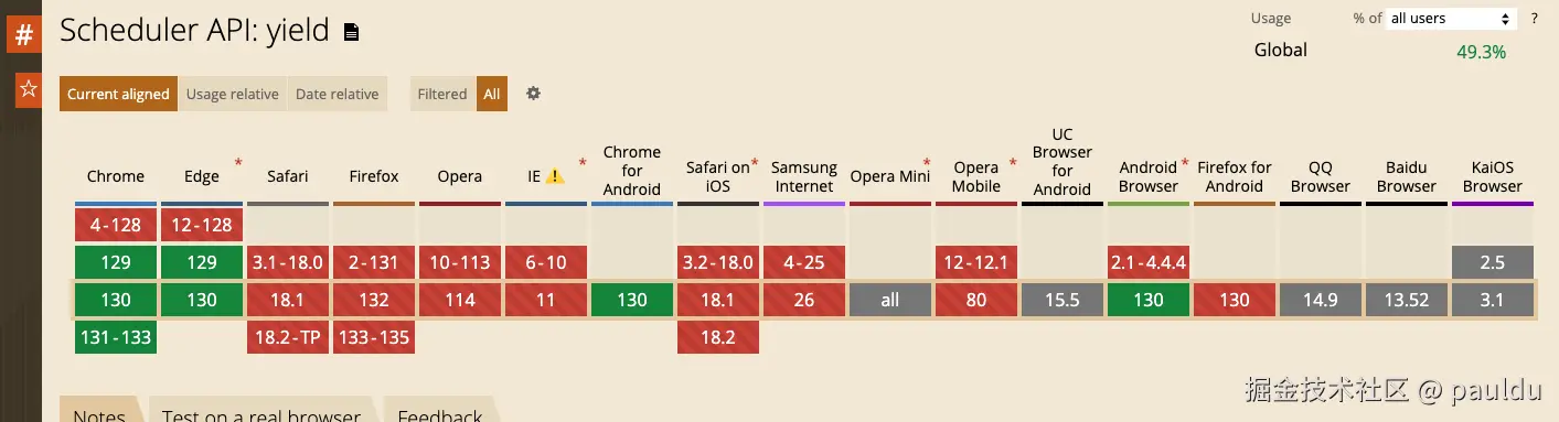 在查找 setTimeout 的资料的时候,发现了有一个比较好的东西,scheduler.yield, 感兴趣的老板可以点击我进行体验,目前兼容性不好(24年8月21日的才支持),不做详细介绍。