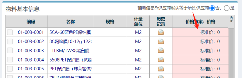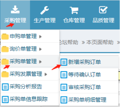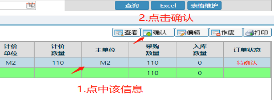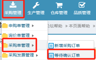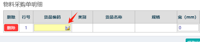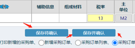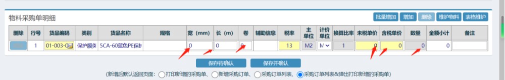 ![]() ![]() 1. 在”采购管理-->采购单管理-->新增采购订单”(如图1),在本页面填好相关信息后,确认信息无误后点击”保存并确认”(如图2) ![]() 图1 ![]() 图2 2. 流程:首先选择供应商,点击供应商后的小正方框,在弹出的窗口查询出要选择的供应商,然后点中即可 ![]() 3. 然后点击货品编码下的黄色框,弹出的窗口查询出要采购的物料,然后点中红色的一栏 ![]() ![]() 4.然后填写宽,长,卷,单价,数量等信息后,点击”保存并确认”. ![]() 补充说明:如果点击的是”保存待确认”,需要到确认界面进行确认操作.(如图3) ![]() ![]() 图3