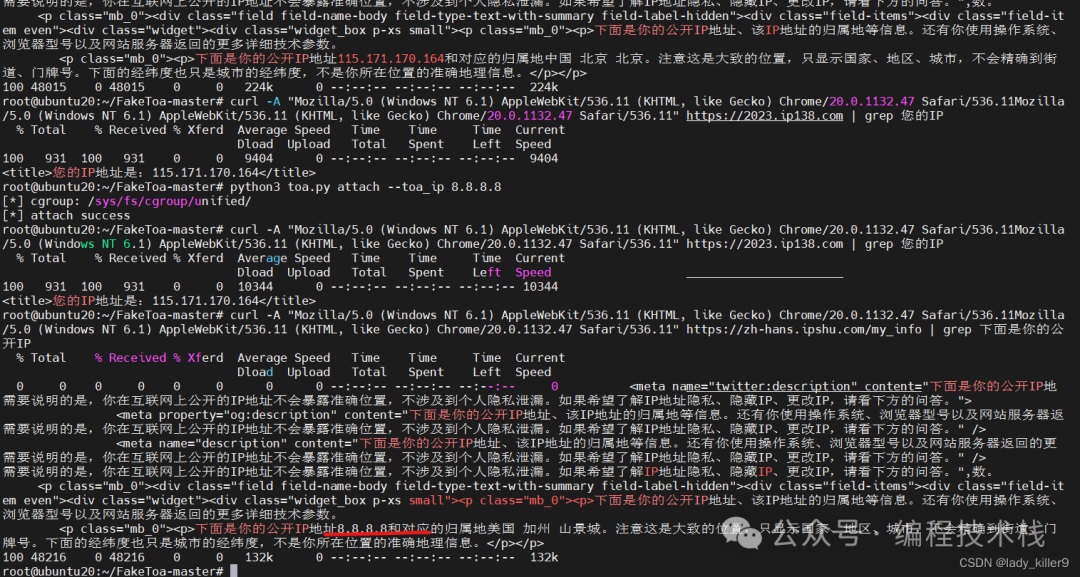 curl -A "Mozilla/5.0 (Windows NT 6.1) AppleWebKit/536.11 (KHTML, like Gecko) Chrome/20.0.1132.47 Safari/536.11Mozilla/5.0 (Windows NT 6.1) AppleWebKit/536.11 (KHTML, like Gecko) Chrome/20.0.1132.47 Safari/536.11" https://2023.ip138.com | grep 您的IP