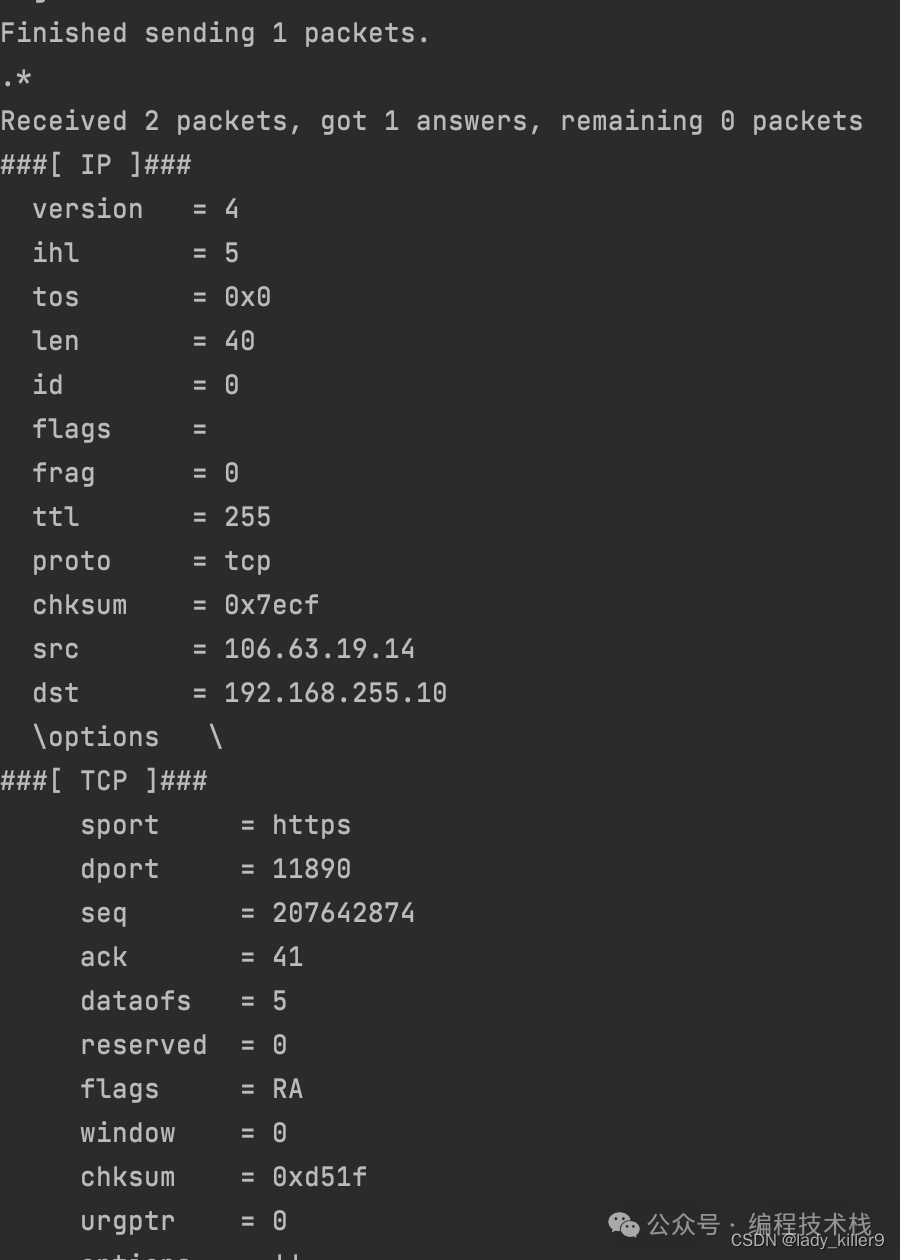 # 检查是否收到 SYN+ACK 数据包