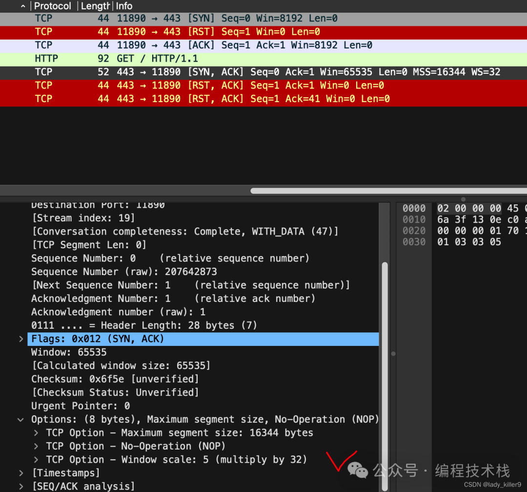 ack = TCP(sport=syn_ack[TCP].dport, dport=target_port, flags='A', seq=syn_ack[TCP].ack, ack=syn_ack[TCP].seq + 1)