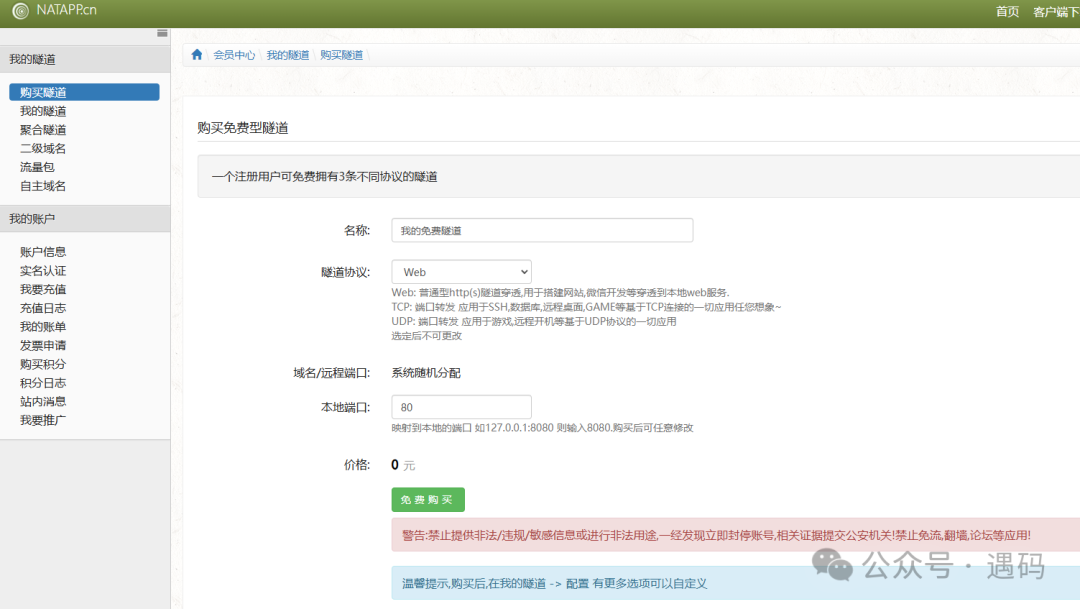 一个注册用户可免费拥有3条不同协议的隧道,如:Web、TCP、UDP。