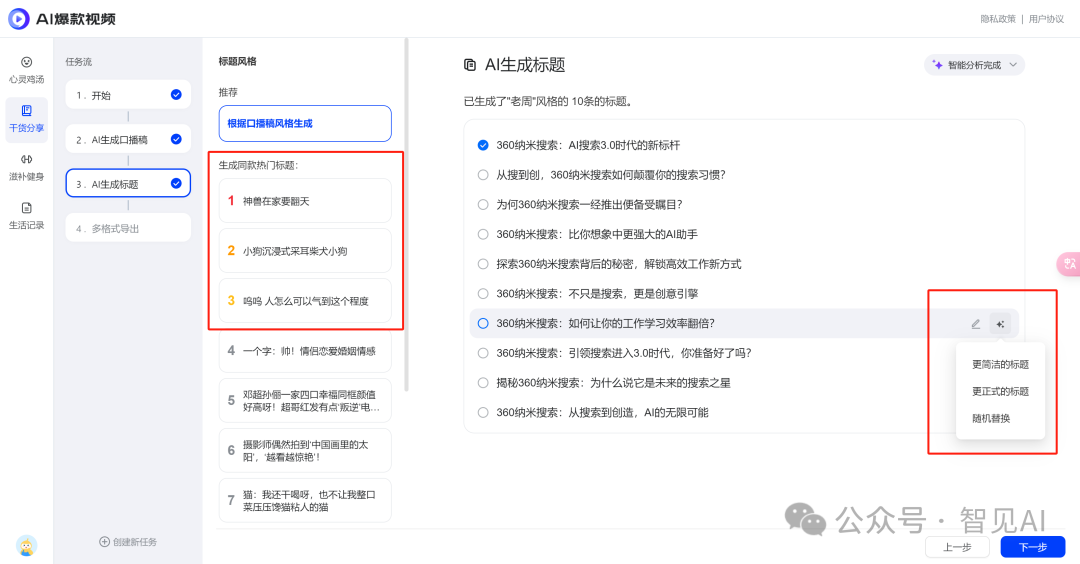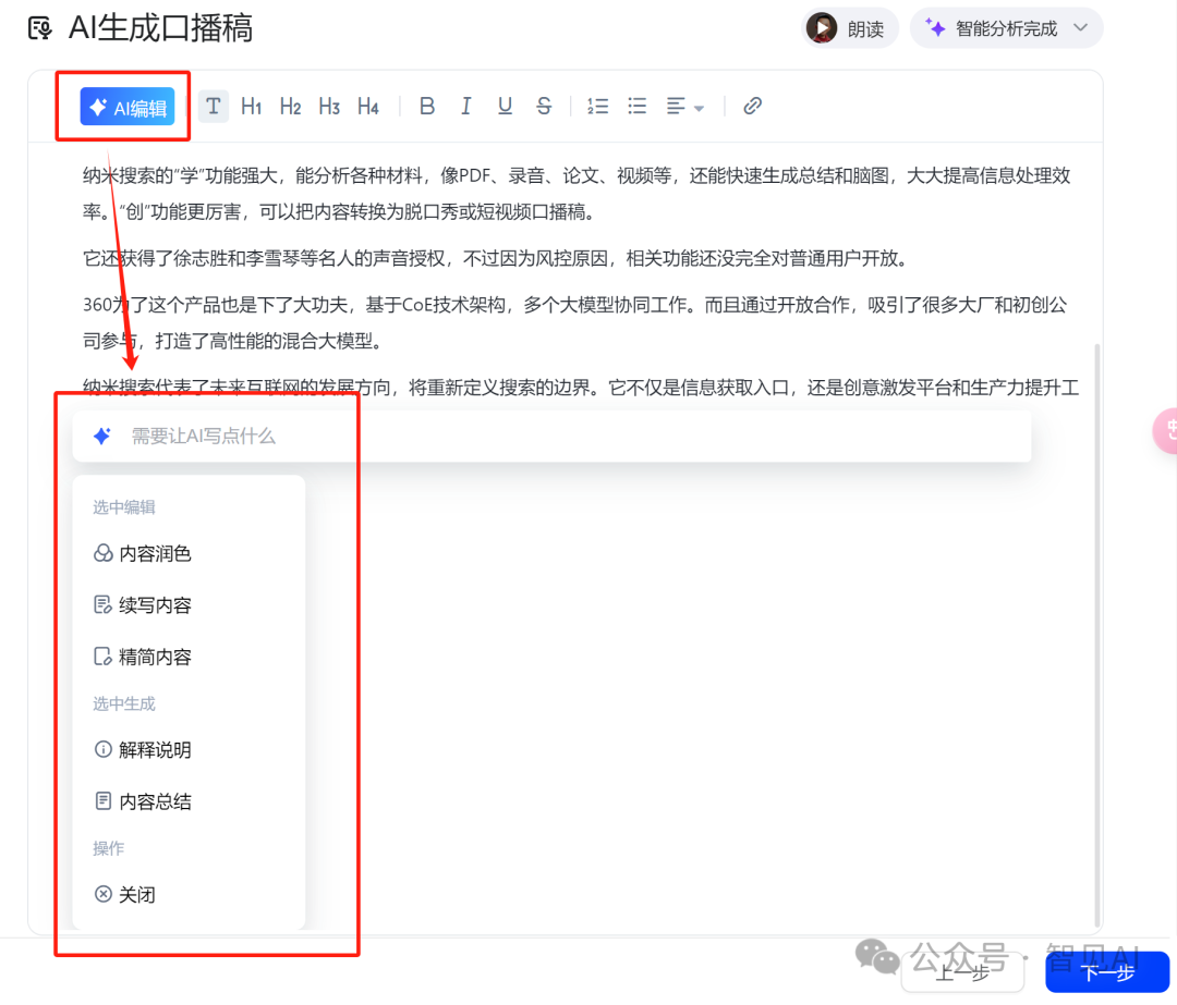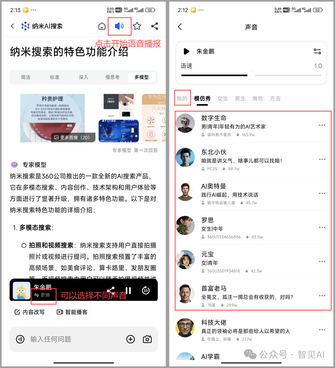 上一篇文章介绍了纳米搜索的多模态搜索功能,另外它特有的【慢思考模式】【多模型协作】让很多朋友表示很震撼。写的功能很好理解,纳米搜索支持将输出的答案原文进行二次创作,目前支持小红书体、新闻稿、口播稿、脱口秀等7种文风的改写。这个功能算是打通了自媒体人搜与写的工作流程,直接将搜索的结果一键转换为不同场景的文稿,我们要做的只是对文稿进行正确性的确认以及风格化的加工。读的功能比较新颖。可以将搜索的结果进行语音播报,支持选择不同人的声音。目前收录了李雪琴和徐智胜等人,脱口秀自由了