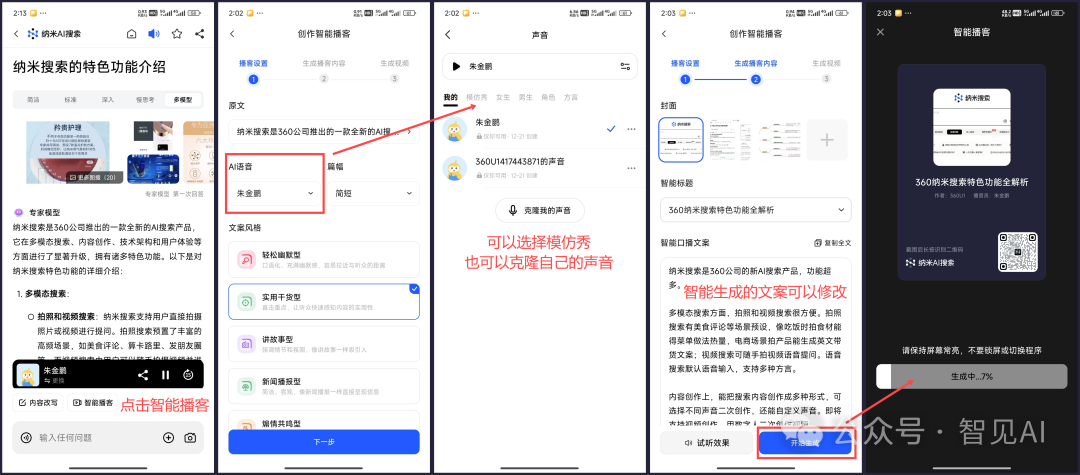 。比较特别的是,可以选择训练出自己的声音,实测声音相似度很高,大家可以试试。如果你认为搜索的结果有用,那就可以将搜索结果通过智能播客的功能做成播客视频分享给其他人。全流程只有点选的操作,80岁老奶奶都会,具体流程如下:想想朋友听着自己声音的播客,想想还挺刺激的