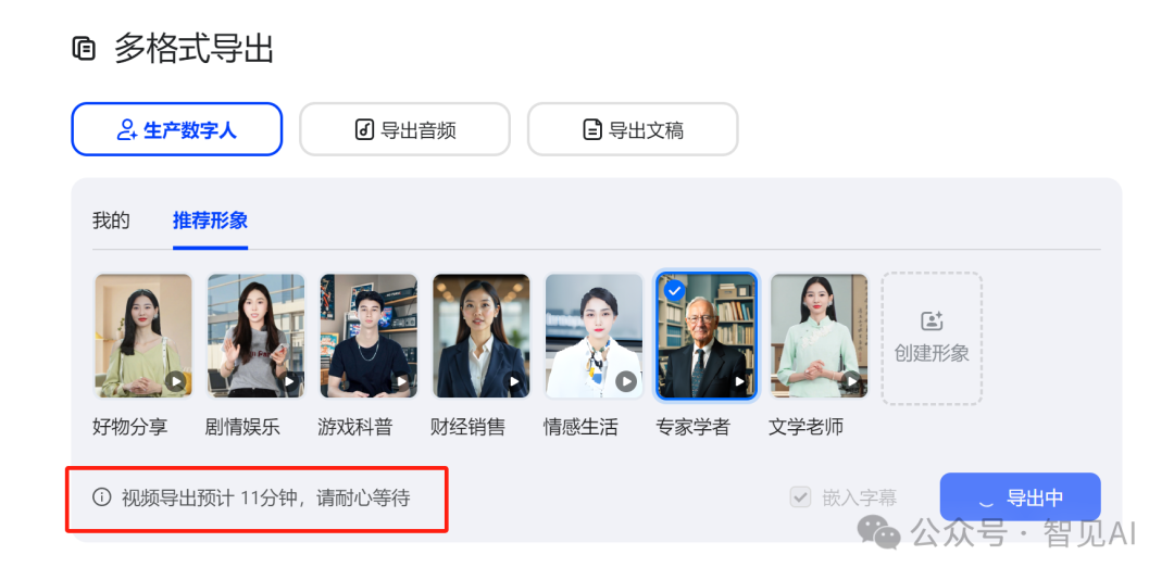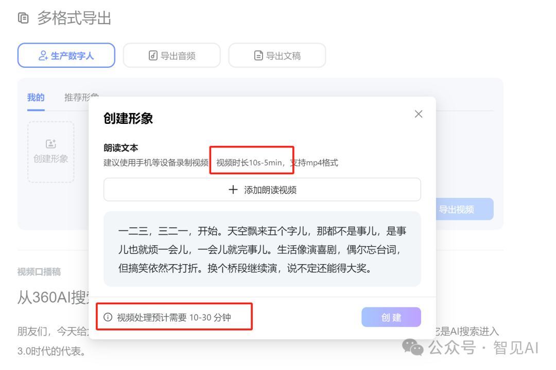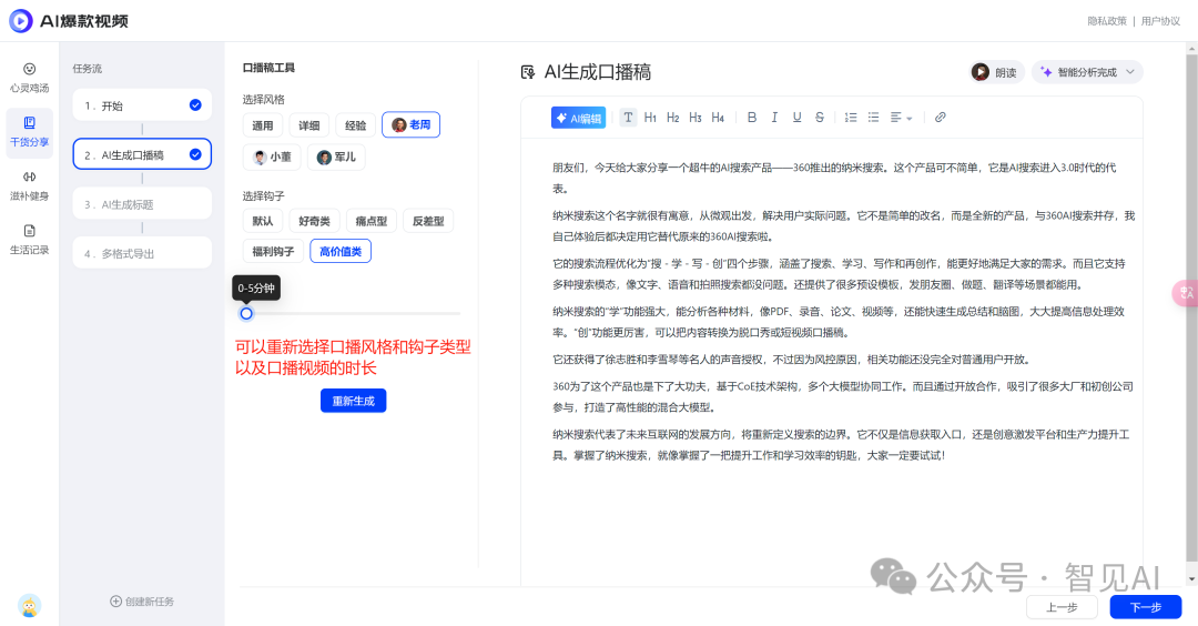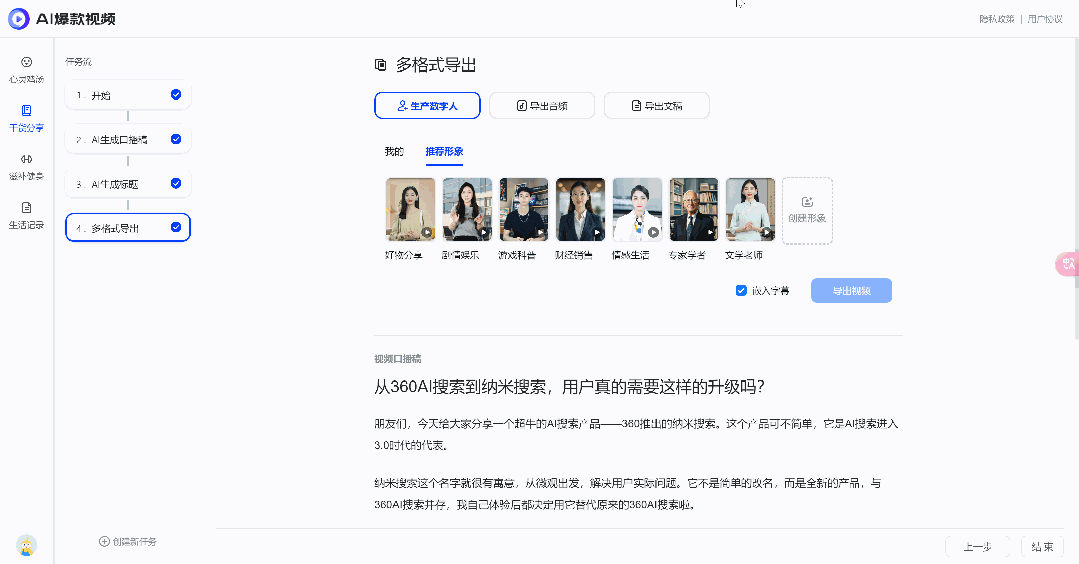 。纳米搜索的写与读功能,实际上是服务于AI搜索结果的输出与分享场景,创新地引入播客功能,使得知识分享变成一个更有趣的社交场景。入口在网页端首页的下方,很显眼的大字【AI爆款视频】,下面我就以【做一个介绍纳米搜索的口播视频】为目的,给大家详细演示一下怎么操作。进入功能主页面后会展示可以创作的爆款视频类型,包括抖音、小红书、视频号、B站等,应有尽有!同时介绍了平台对于这几个视频平台内容特色的理解,选择不同的类型会有相应的优化,这里演示以视频号为例。进入视频号创作流程后,左侧一列可以选择视频的类型,目前包含了4种高频的类型,我这就属于干货分享的类型。页面的中央则是素材上传区域,基本上你能想到的素材类型都可以上传,本地的文件、网页链接、粘贴的文本,流媒体目前支持了抖音和B站。上传完所有参考的素材后直接点击下方的生成口播稿,就可以先按照官方的默认的配置生成一篇干货分享语气的初稿。在中间的口播稿工具一栏,可以重新选择口播的风格以及钩子的类型,我这里选择了经验和高价值类,符合我分享内容的主题。点击重新生成后,就会在右侧得到一篇符合要求的口播稿。这时可以手动修改也可以继续让AI帮你编辑。到这一步,你其实是可以利用里面的文本编辑功能把文章修改完,直接复制出去写一篇公众号的。这里我们选择继续生成口播视频,点击下一步。这时,会首先进入到标题的确认流程,系统会根据你选择的语气以及钩子类型帮你自动生成十条标题。你可以根据左侧的热门标题进行重新生成,也可以对已有的标题进行手动编辑或者AI润色。接下来,会进入多格式导出流程,这里可以选择导出多格式的文稿;还可以导出音频格式,可以选择系统内置的音色,这里和上面的播客功能比较类似。选择一个预设的形象后直接选择导出,这时系统会给到一个导出倒计时,一般会提示12分钟,实际导出时长要短一些。除了使用预设的数字人形象,还可以根据自己的形象去定制数字人,这里只需要上传自己一段10s-5min的朗读视频即可,理论上时长越长效果越好,但对应的处理时长就会更长。这里我自己对着系统给的文稿录了一段20s的视频,上传创建后,整体的数字人训练时长大概在15分钟左右。训练完成后,选中自己的数字人,点击导出视频,导出时长大约5分钟左右。给大家直接看实际效果,鄙人献丑了